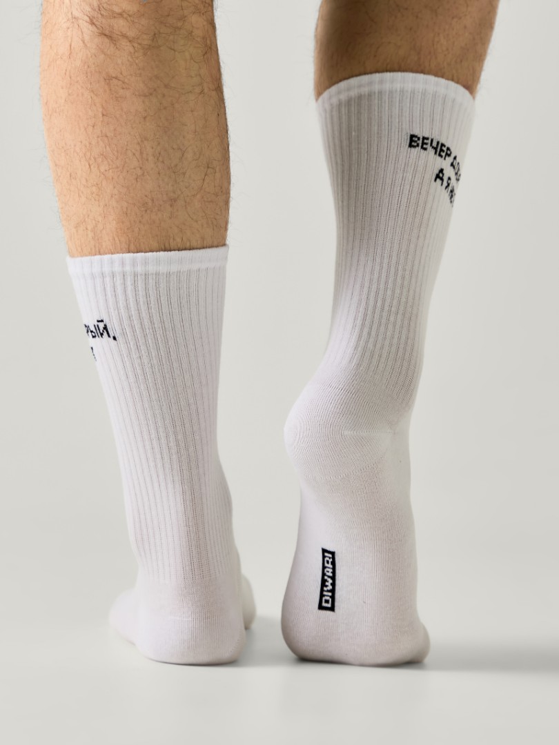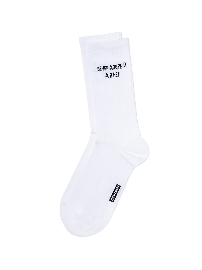 Șosete DIWARI ACTIVE 219 - inscripție ironică „BUNĂ SEARA, ȘI NU SUNT” pentru a stabili starea de spirit. Practicitate și umor într-o singură pereche. Tehnologie fără cusături Impregnare antibacteriană Culoare: alb - alegerea universală Ideal pentru stilul informal.