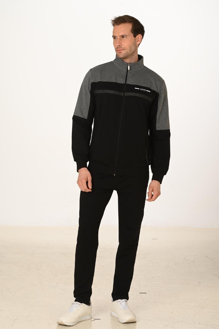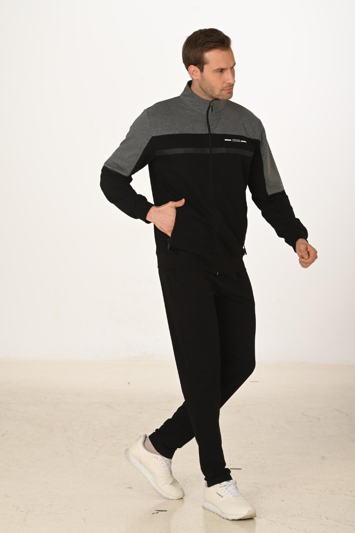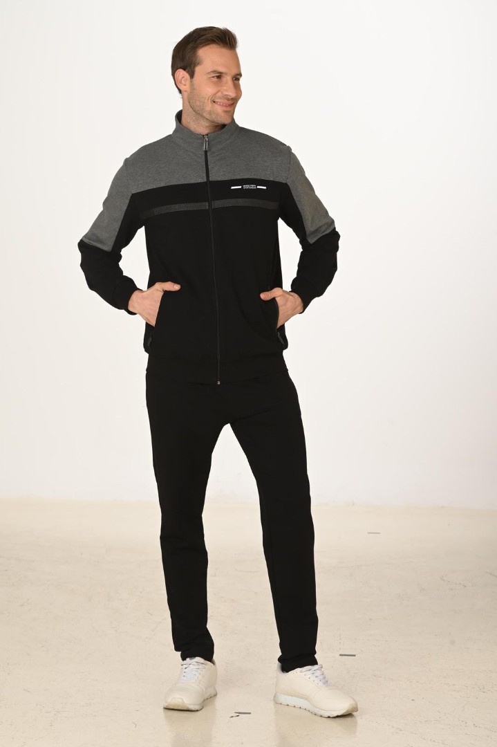 Costum sport pentru bărbați. Nu se decolorează și nu lasă urme pe genunchi. Are 4 buzunare cu fermoar. Detaliu sub formă de bandă pe piept. Croială dreaptă. Asigură confortul și mobilitatea datorită țesăturii din lycra.