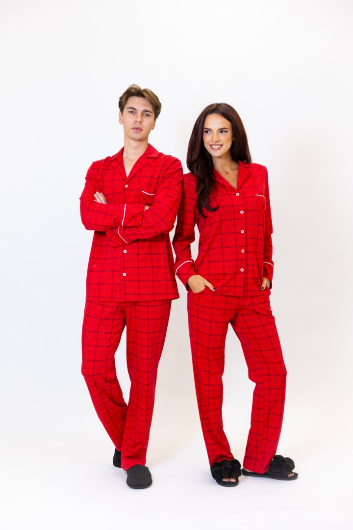 Costum de casă din bumbac. Cămașă cu mâneci lungi și nasturi. Pantaloni drepți cu buzunare laterale.