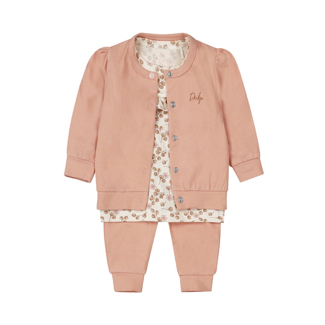 Acest set minunat este confecționat din bumbac organic moale și elastic, care va asigura confortul maxim pentru micuța ta. Cămașa cu mâneci lungi de culoare albă este decorată cu un imprimeu floral drăguț în nuanțe de maro și roz. Cămașa cu mâneci lungi are volane drăguțe pe piept și nasturi pe umeri. Cardiganul cu mâneci scurte bufante se închide cu nasturi în față. Manșetele elastice de la baza pantalonilor mențin pantalonii în poziție, păstrând picioarele bebelușului dvs. la căldură. Hainele din bumbac organic sunt alegerea perfectă pentru părinții care doresc ce este mai bun pentru copiii lor. Aceste haine, confecționate din bumbac cultivat organic, sunt moi, confortabile și sigure pentru pielea sensibilă a bebelușilor. În plus, ele contribuie la îmbunătățirea stării planetei datorită metodelor ecologice de cultivare. Alegeți bumbacul organic pentru a vă răsfăța copilul și a proteja planeta.
