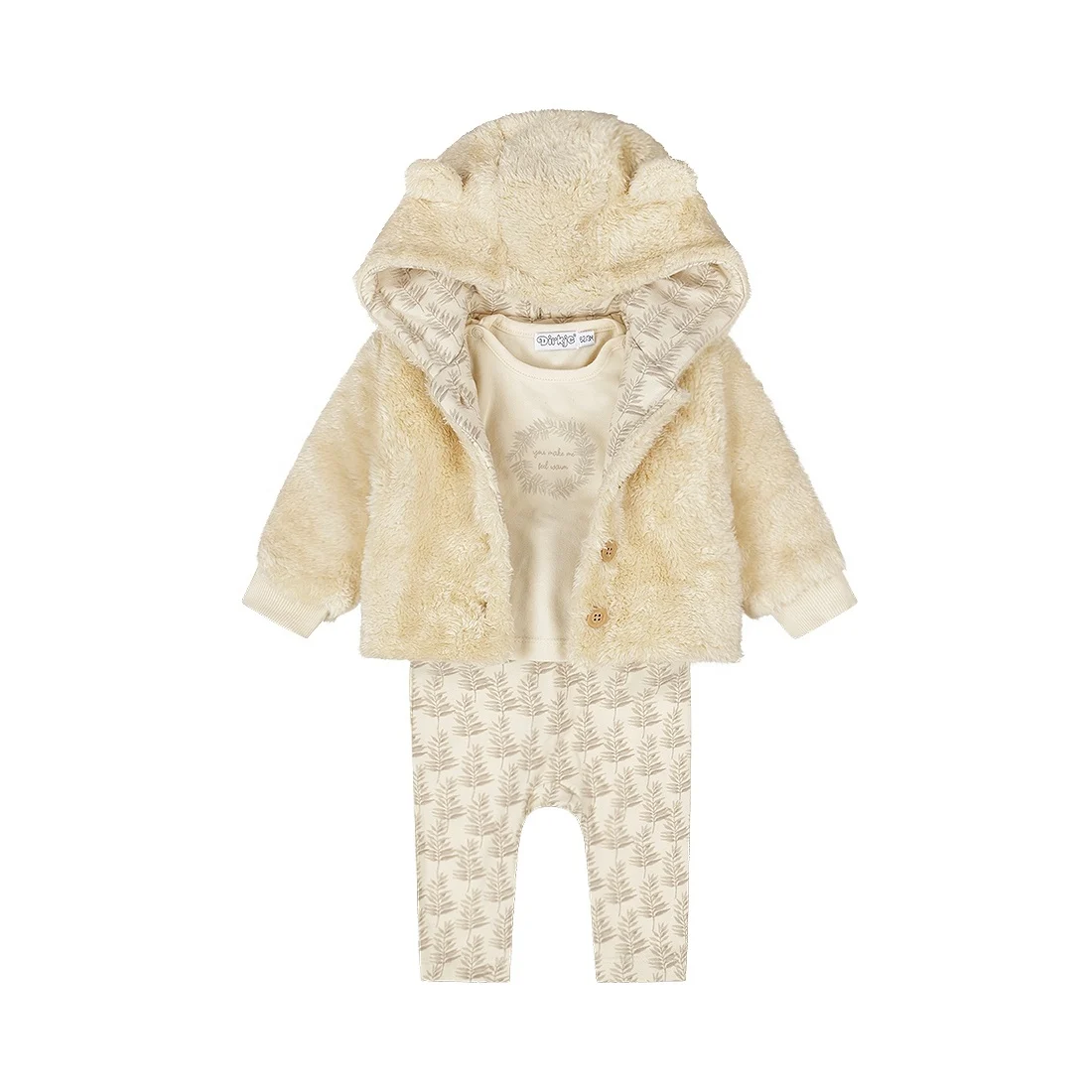 Set drăguț este perfect pentru fetița ta. Vesta moale din blană artificială alb-gălbui, cu glugă, o ține pe micuță de cald și poate fi purtată și ca vestă pentru exterior. Foarte drăguță: interiorul are un imprimeu frumos. Bluza cu mânecă lungă alb-gălbui are un imprimeu drăguț pe față și capse practice pe umeri. Pantalonii asortați pentru fetițe, cu imprimeu botanic, au o talie moale cu nasturi pentru confort sporit.