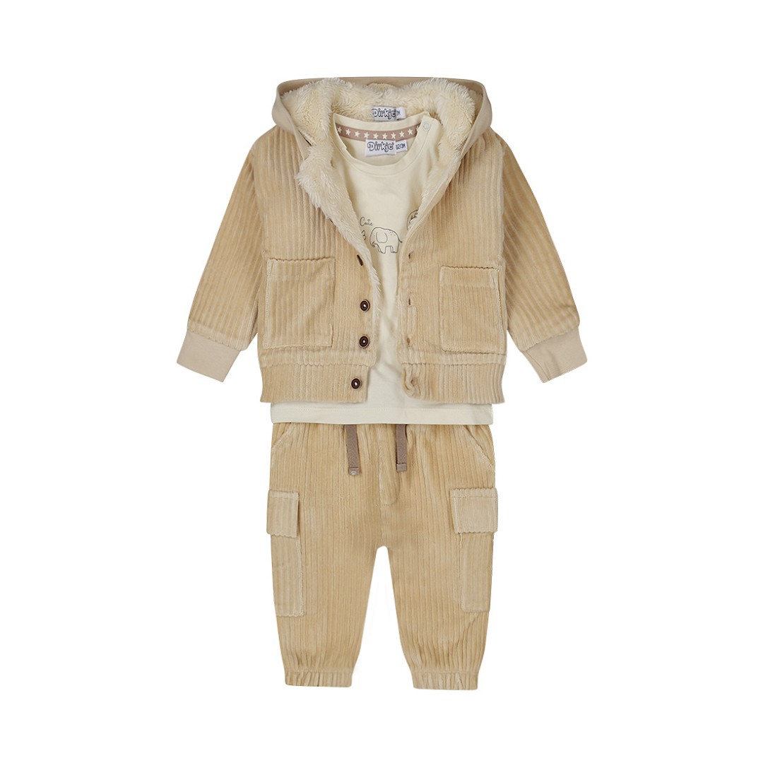 Set din 3 piese oferă tot ce cauți în zilele mai reci. Cardiganul bej și pantalonii cargo asortați sunt confecționați din velur moale, cu o textură fină cu nervuri, ceea ce îi face extrem de confortabili la atingere. Cardiganul pentru băieți are o căptușeală tip teddy, glugă și buzunare drăguțe. Bluza cu mânecă lungă alb-gălbui, cu imprimeu cu animale sălbatice, este confecționată din bumbac moale, elastică și are capse practice pe umăr. O combinație perfectă de căldură și confort pentru micuțul tău!