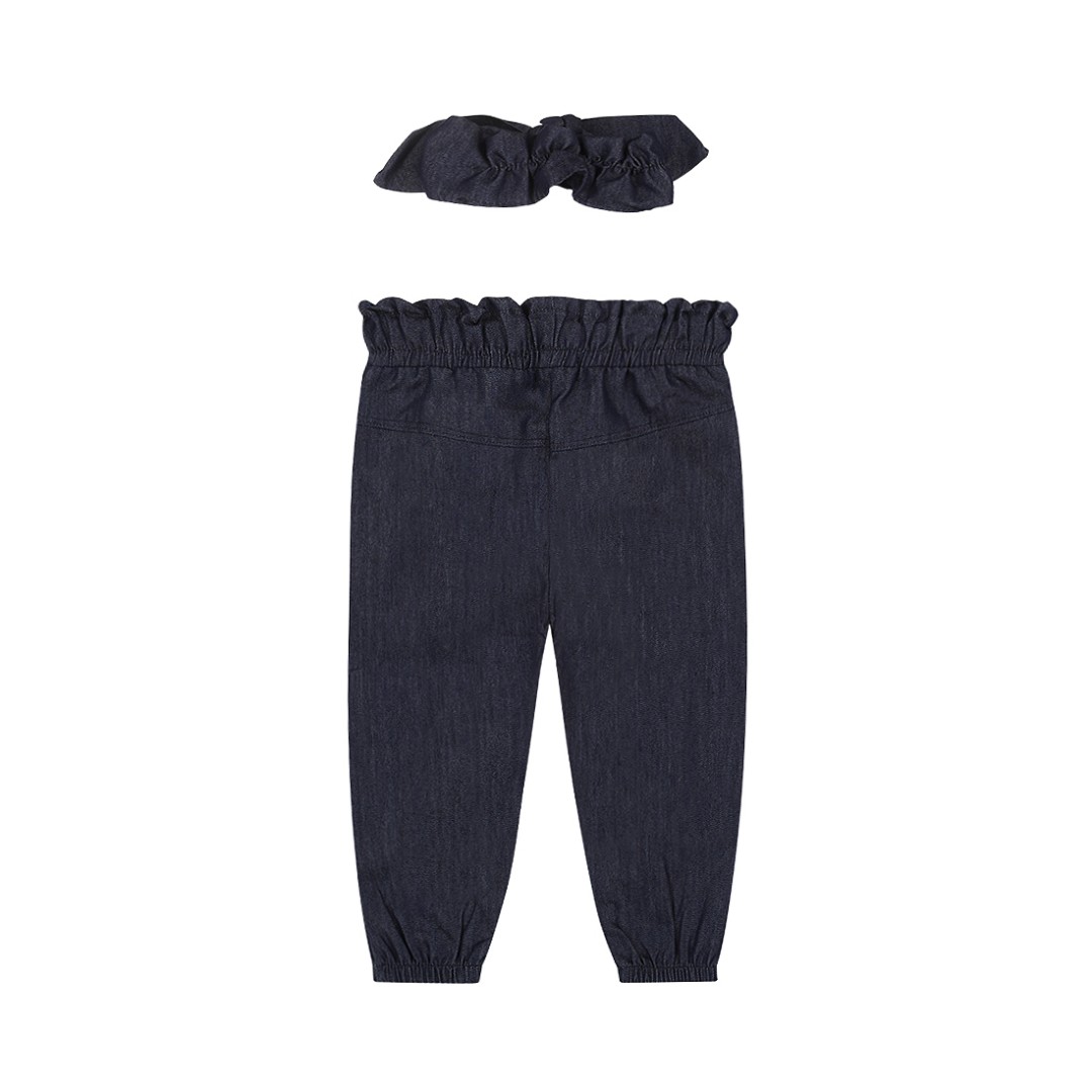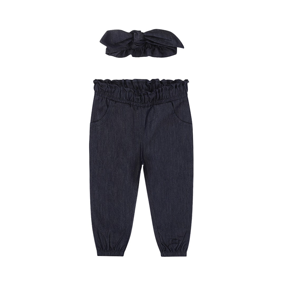 Cu acest set, micuța ta va avea tot ce are nevoie pentru un look casual și elegant! Pantalonii albastru închis, cu croială lejeră și aspect de blugi, sunt o alegere confortabilă pentru fiecare zi. Datorită taliei elastice și manșetelor, pantalonii fetiței se potrivesc frumos. Benzile de păr asortate cu fundiță adaugă o notă jucăușă.