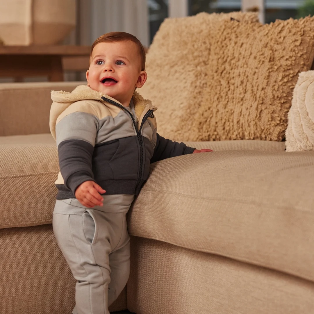 Perfectă pentru plimbări răcoroase! Aceast cardigan de exterior este alegerea ideală pentru sezonul rece. Combinațiile de culori maro deschis, albastru deschis și albastru închis conferă vestei pentru băieți un aspect cool, în timp ce căptușeala călduroasă și gluga oferă confort suplimentar. Fermoarul convenabil face ca vesta să fie ușor de îmbrăcat și dezbrăcat, menținând în același timp copilul de cald în timpul unei zile de iarnă.