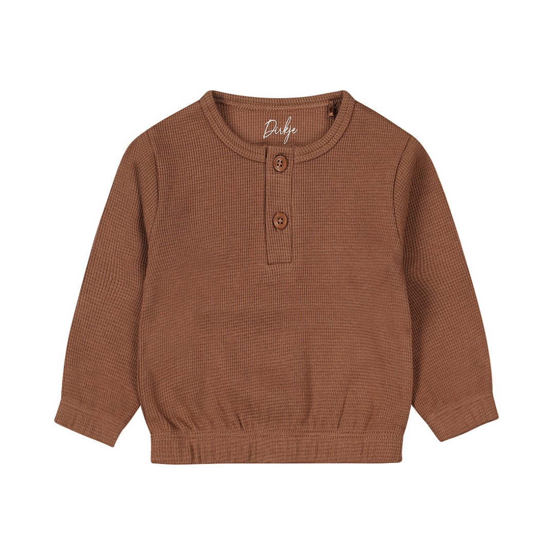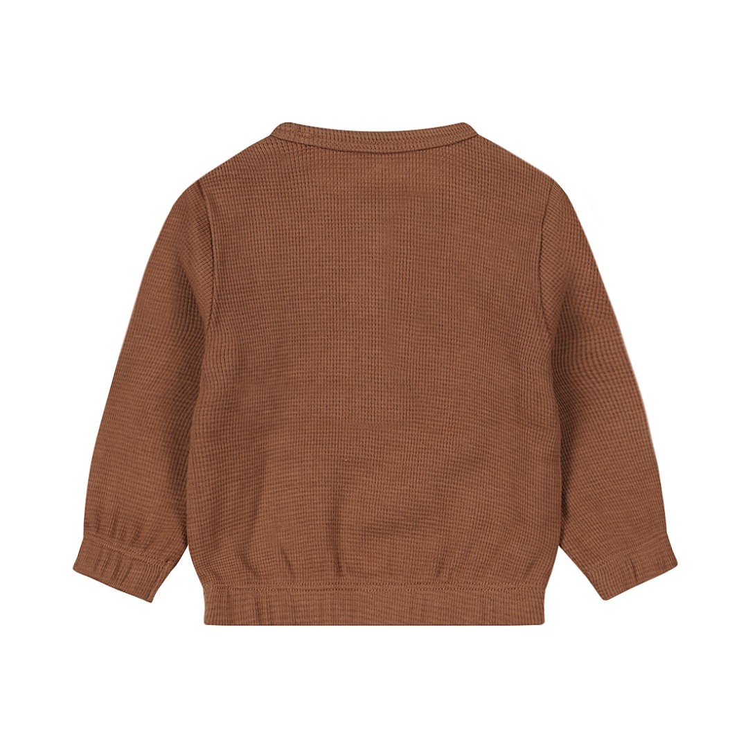 Minunat pulover este confecționat dintr-un bumbac organic moale, elastic. Minunat de confortabil. Puloverul are o ușoară structură în material, ceea ce îl face și mai drăguț. Puloverul de culoare maro are o bordură elastică și nasturi în față.