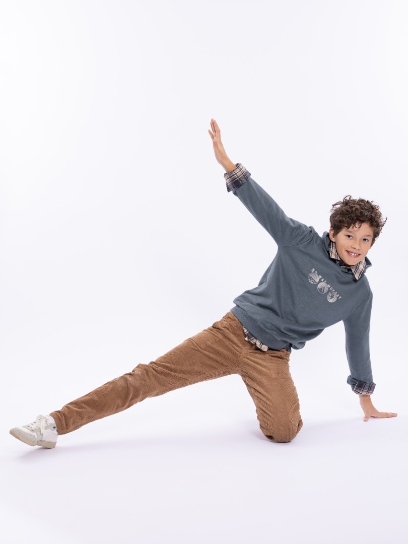 Hanoracul cu glugă pentru băieți este realizat într-o nuanță delicată de albastru și decorat cu un imprimeu pe piept. Hanoracul se asortează ușor cu blugi sau pantaloni sport și este perfect pentru orice zi.