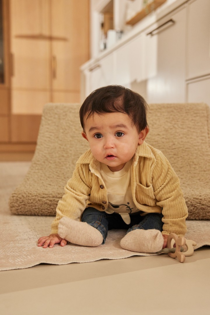 Pulover este o completare veselă pentru orice garderobă de iarnă. Combinația jucăușă de culori maro deschis, alb-gălbui și albastru închis creează un aspect cool, în timp ce imprimeul drăguț cu morse de pe față adaugă un accent dulce. Puloverul este confecționat din bumbac moale și elastic, așa că micuțul tău se va simți confortabil toată ziua.