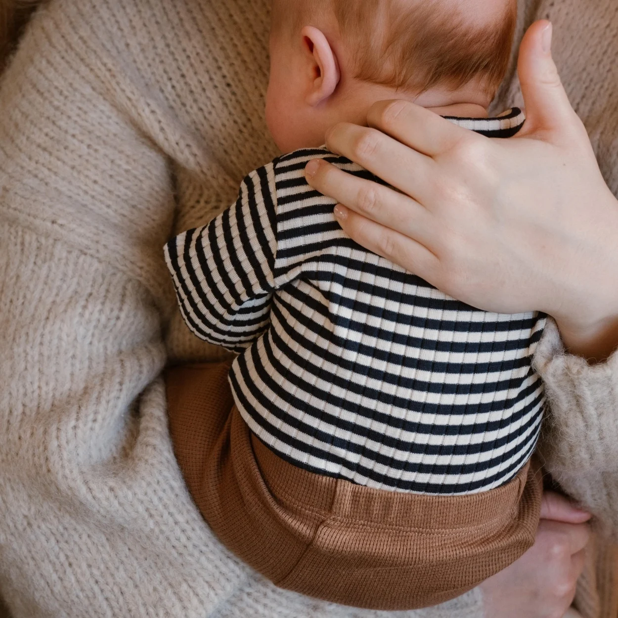 Hanorac cu mânecă lungă este în dungi albastru închis și albe și este confecționat dintr-un bumbac organic moale, elastic. Structura materialului este deosebit de plăcută. Hainele pentru bebeluși din bumbac organic sunt alegerea ideală pentru părinții care își doresc ce e mai bun pentru bebelușii lor.