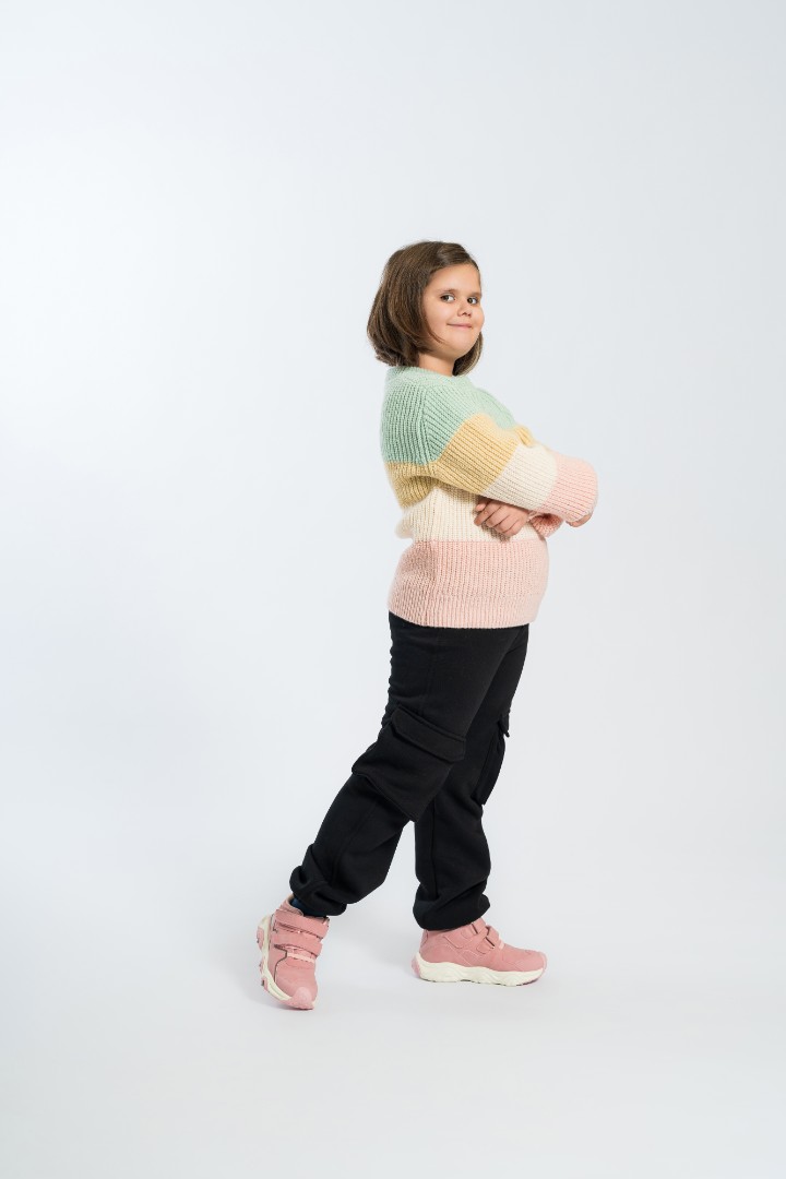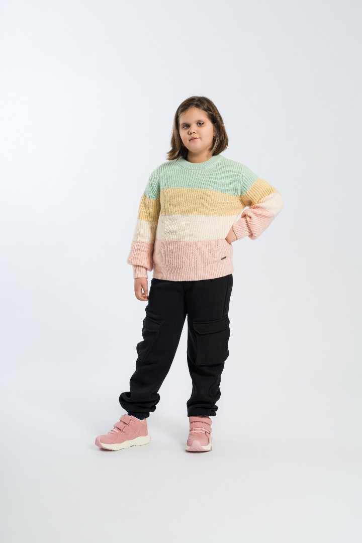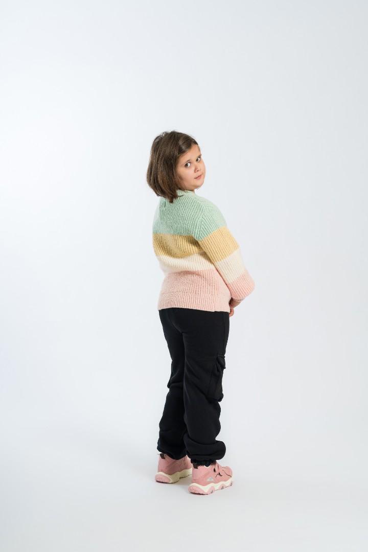 Puloverul atrage atenția prin dungile sale frumoase în culori mentă, bej, alb delicat și roz, care împreună creează un aspect proaspăt și vesel. Croiala confortabilă și culorile jucăușe fac acest pulover ideal pentru purtarea de zi cu zi!