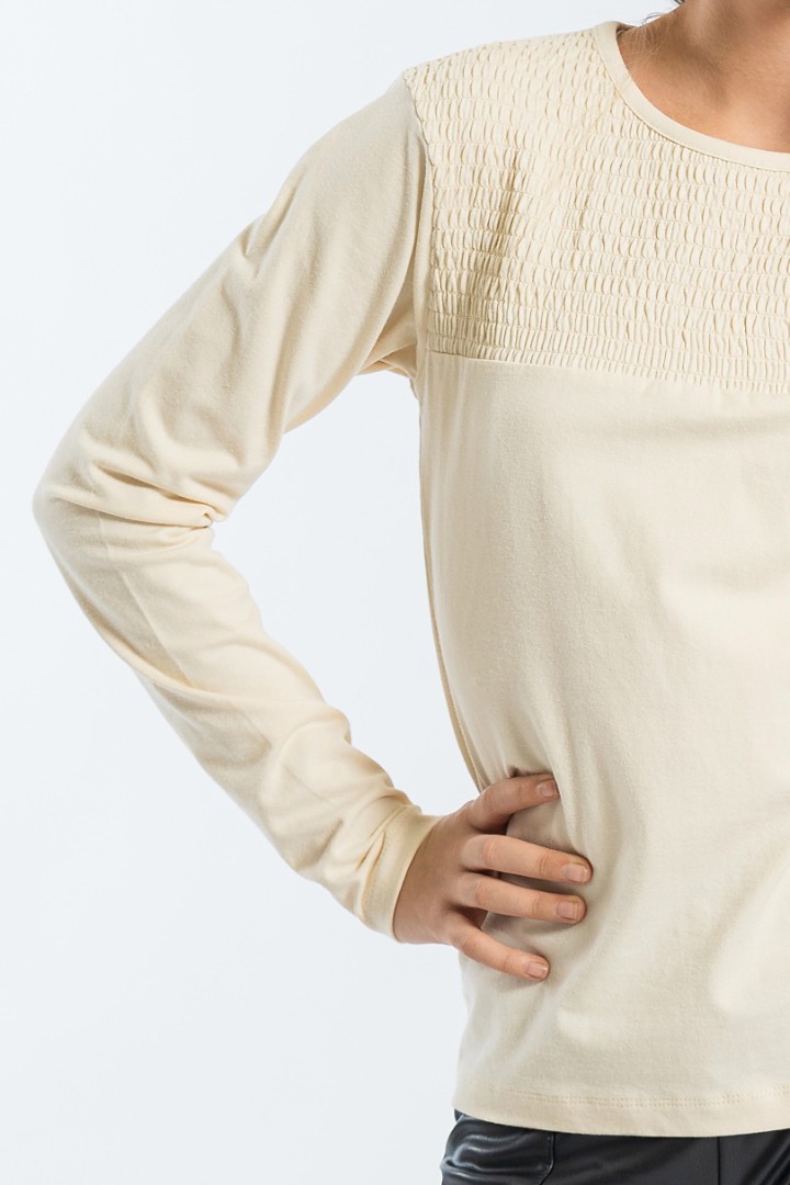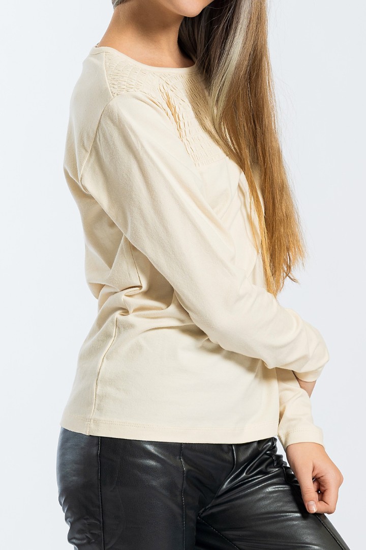 Tricoul cu mâneci lungi este un articol de bază al garderobei, cu un plus de originalitate. Confecționat din bumbac moale cu adaos de elastan, are o cusătură în partea de sus, care îi conferă un accent jucăuș. Ideal pentru combinații infinite!