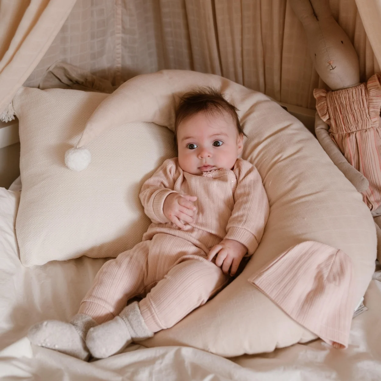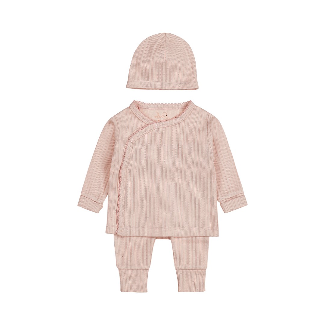 Costumul este creat pentru cei mai mici, fiind confecționat din bumbac organic moale. Setul de culoare roz pal este format dintr-o cămașă cu mâneci lungi, pantaloni și o căciulă asortată și se remarcă prin textura plăcută a țesăturii. Cămașa are mâneci lungi cu manșete, datorită cărora poate fi purtată mai mult timp. Cămașa are o închidere subțire cu nasturi, ceea ce o face ușor de îmbrăcat și de dezbrăcat. Pantalonii au manșete la picioare și o talie foarte largă pentru un plus de confort. Desigur, talia poate fi ușor întoarsă. Pălăria asortată va încălzi micuțul dumneavoastră. Hainele pentru copii din bumbac organic sunt alegerea perfectă pentru părinții care doresc ce este mai bun pentru copiii lor. Aceste haine, confecționate din bumbac cultivat organic, sunt moi, confortabile și sigure pentru pielea sensibilă a copiilor. În plus, ele contribuie la îmbunătățirea stării planetei datorită metodelor ecologice de cultivare. Alegeți bumbacul organic pentru a vă răsfăța copilul și a proteja planeta.