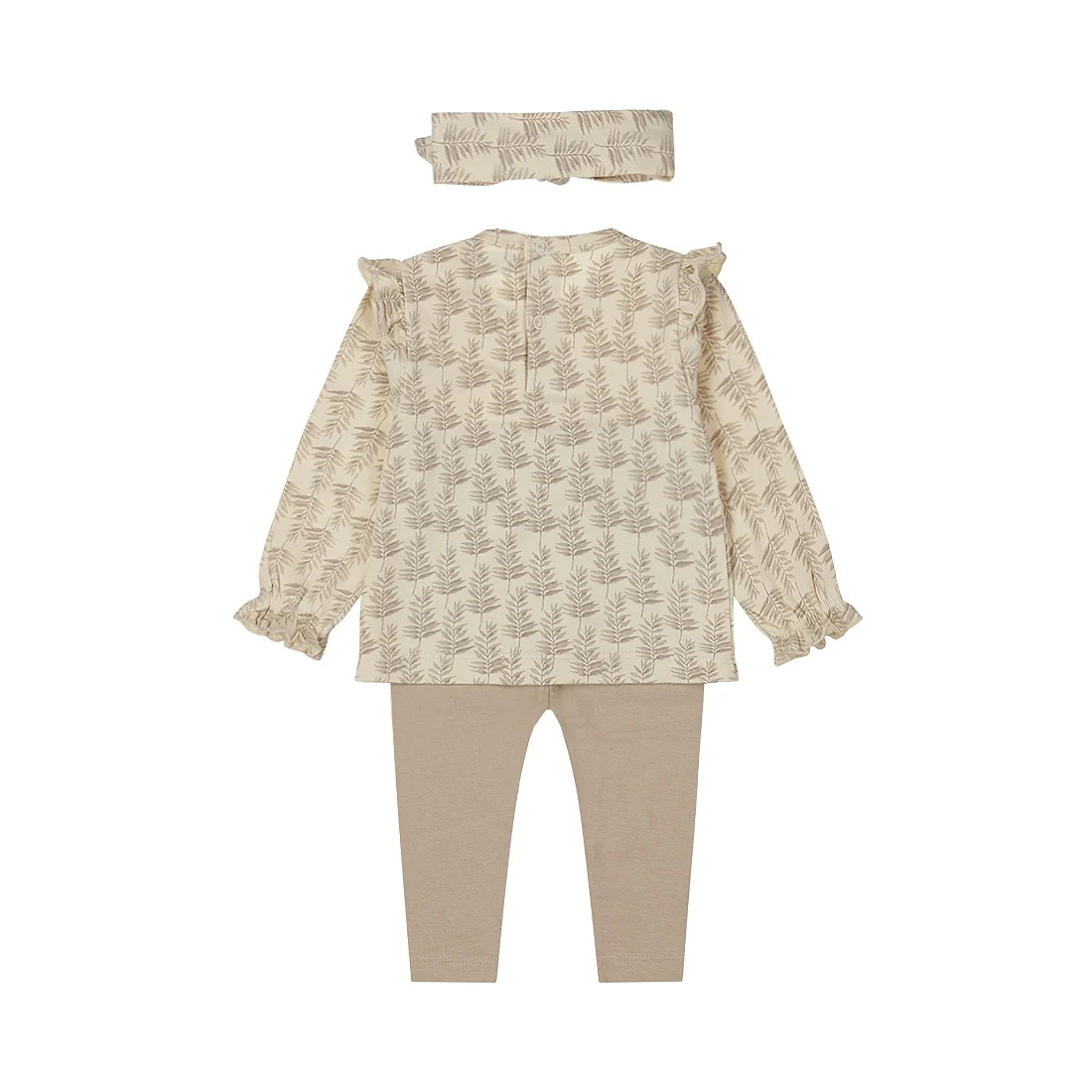 Acest set drăguț Dirkje este pur și simplu indispensabil pentru micuța ta! Mânecile lungi de culoare bej sunt decorate cu un imprimeu floral drăguț, volane pe umeri și elastic la manșete. Datorită nasturilor din spate, cămașa se îmbracă și se dezbracă ușor. Pantalonii de culoare gri-maro au o talie elastică pentru o potrivire confortabilă. Setul este completat de o bandană asortată cu fundă. Confecționat din bumbac moale cu adaos de elastan pentru o libertate de mișcare suplimentară.