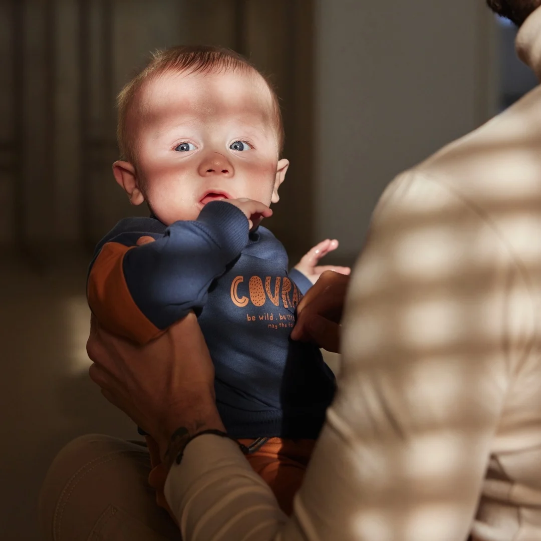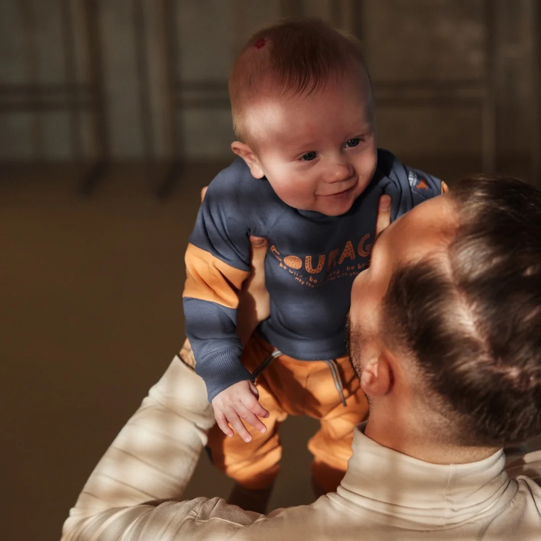 Costum de baiat cald pentru zilele reci. Pulover albastru închis pentru băieți cu detalii spectaculoase. Blugi cu talie elastică și manșete pentru un plus de confort. Puloverul și pantalonii sunt confecționați din bumbac moale, astfel încât bebelușul să se poată mișca liber în timpul zilei.