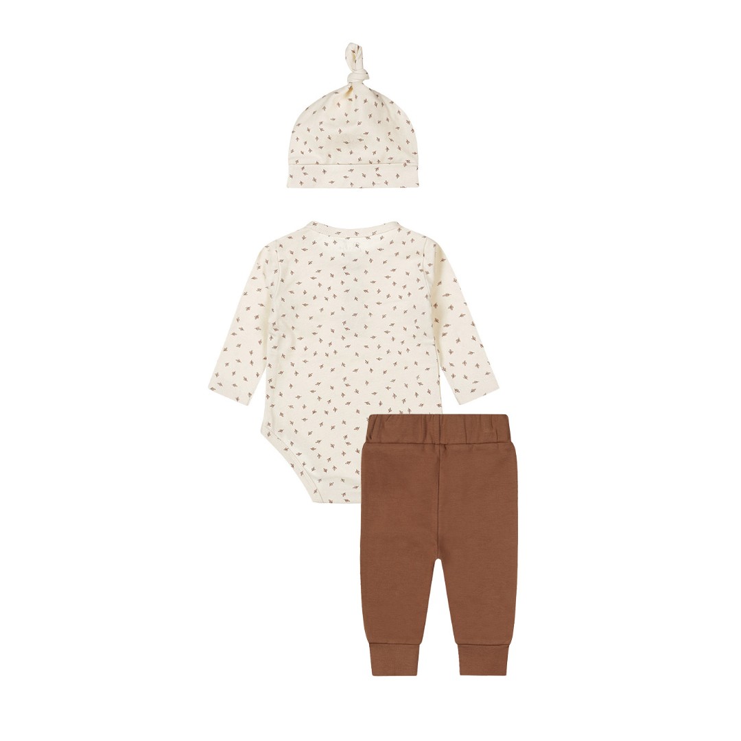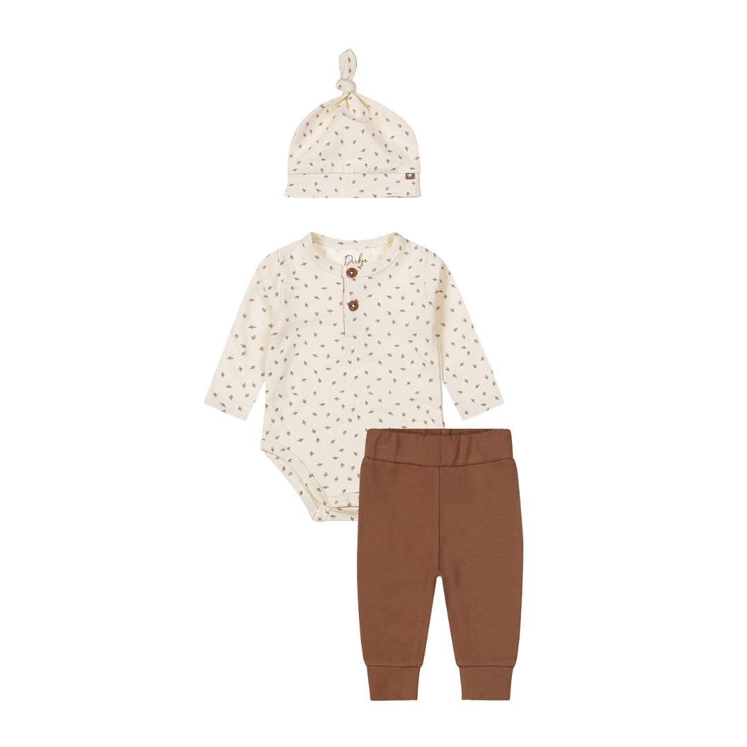 Părinților care acceptă cu bucurie surpriza sexului copilului, le sugerăm să se familiarizeze cu gama noastră unisex. Setul Dirkje este format dintr-o salopetă, pantaloni și o căciulă, confecționate din bumbac moale cu adaos de elastan, ceea ce asigură un nivel ridicat de confort. Salopeta este de culoare albă, cu un imprimeu drăguț de culoare maro. Body-ul are mâneci lungi, 2 nasturi în față și capse în partea de jos, ceea ce facilitează îmbrăcarea și dezbrăcarea. Pantalonii scurți sunt de culoare maro, cu talie elastică și manșete confortabile la picioare. Manșetele elastice din partea de jos a pantalonilor îi mențin în poziție, păstrând picioarele bebelușului tău la căldură. Completează ținuta bebelușului tău cu o căciuliță drăguță asortată. Hainele pentru bebeluși din bumbac organic sunt alegerea perfectă pentru părinții care doresc ce este mai bun pentru copiii lor. Aceste haine, confecționate din bumbac cultivat organic, sunt moi, confortabile și sigure pentru pielea sensibilă a bebelușilor. În plus, contribuie la îmbunătățirea stării planetei datorită metodelor de cultivare durabile și ecologice. Alegeți bumbacul organic pentru a vă răsfăța bebelușul și a proteja planeta.