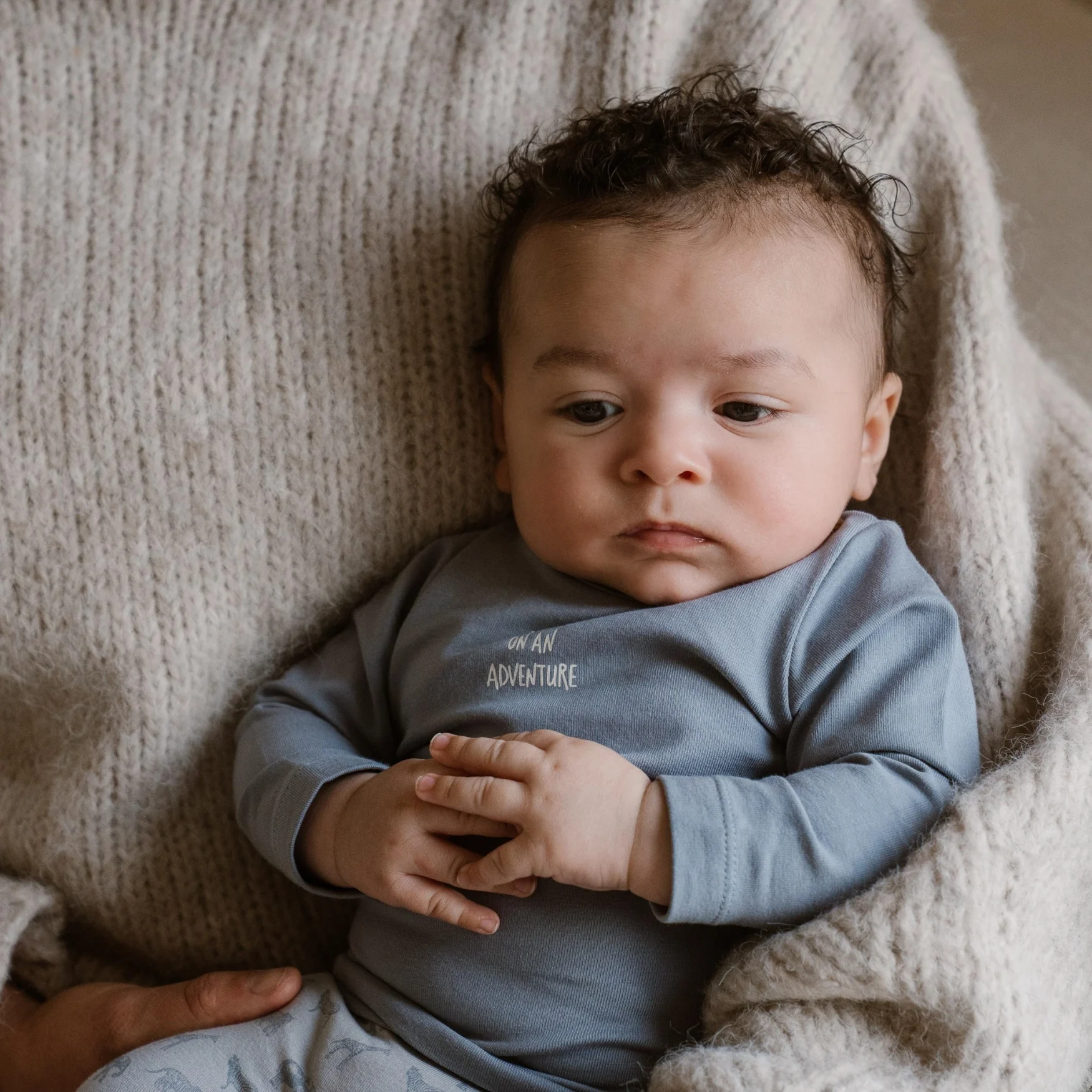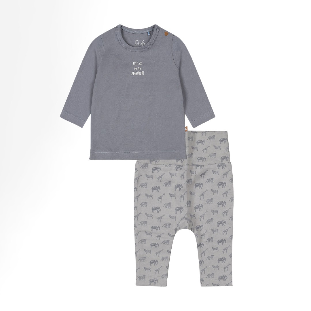Cu acest set drăguț, micuțul tău va fi pregătit pentru o nouă zi imediat. Setul este format dintr-o bluză cu mânecă lungă și pantaloni confecționați din bumbac organic moale, cu elastic, oferind confort suplimentar. Pantalonii pentru bebeluși au un imprimeu animal distractiv și o talie extra lată, pentru o croială extrem de confortabilă. Cămașa albastră cu mânecă lungă are un imprimeu text pe față și se închide cu capse pe umăr. Hainele pentru bebeluși din bumbac organic sunt alegerea ideală pentru părinții care își doresc ce e mai bun pentru bebelușii lor. Fabricate din bumbac cultivat organic, aceste haine sunt moi, confortabile și sigure pentru pielea sensibilă a bebelușilor. În plus, contribuie la o planetă mai sănătoasă prin practici de creștere sustenabile și ecologice. Alege bumbacul organic pentru a-ți răsfăța bebelușul și a proteja lumea.