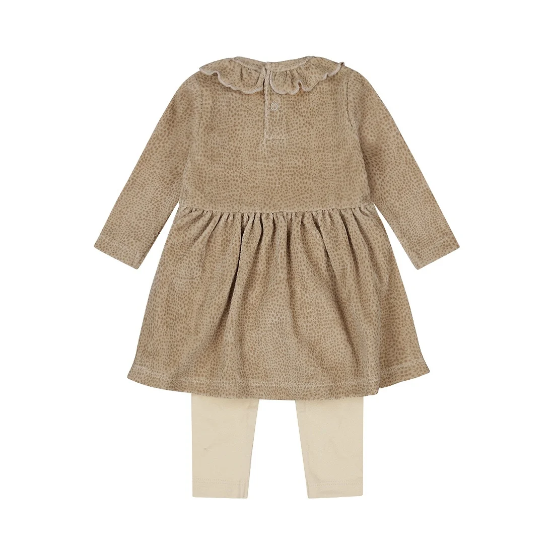Acest drăguț set pentru fetițe este perfect pentru un look adorabil! Rochia bej gri din velur, cu imprimeu jucăuș cu buline, are o fustă evazată elegantă, mâneci lungi și un guler drăguț. Datorită închiderii cu capse de la spate, îmbrăcarea este ușoară. Colanții alb-gălbui asortați completează ținuta. Confecționată din materiale moi.