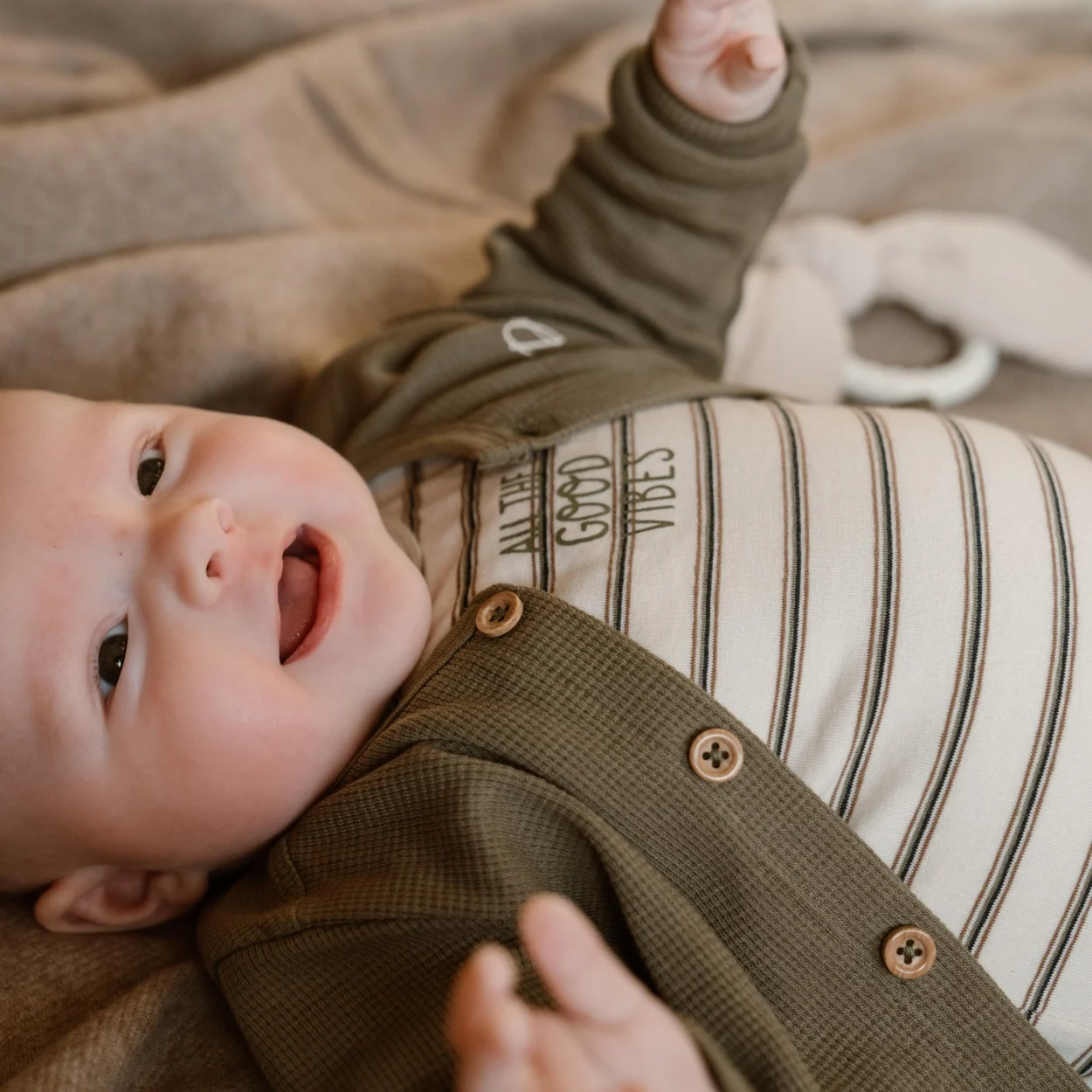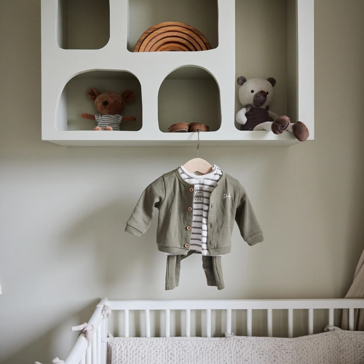 Haine mici, fericire mare. Acest set drăguț pentru bebeluși este format dintr-un tricou, pantaloni și cardigan. Cămașa alb-gălbui cu mânecă scurtă prezintă un imprimeu cu dungi albastru închis, verde și maro și text pe față. Cămașa se închide cu capse pe umăr. Pantalonii sunt verzi, cu nasturi în față și o textură plăcută a materialului. Cardiganul este verde și are o textură plăcută a materialului. Se închide cu nasturi în față. Fabricate din bumbac organic, aceste haine sunt moi, confortabile și sigure pentru pielea sensibilă a bebelușilor. În plus, contribuie la o planetă mai sănătoasă prin practici de creștere sustenabile și ecologice. Alege bumbacul organic pentru a-ți răsfăța bebelușul și a proteja lumea.