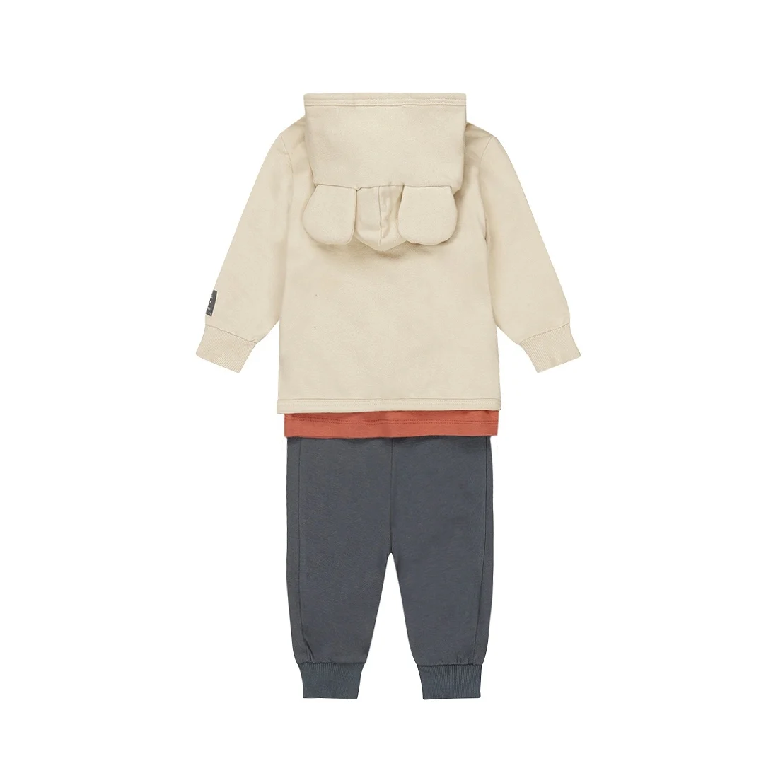 Perfect pentru ca micuțul tău să exploreze și să se joace, acest set din 3 piese. Cardiganul cu glugă maro deschis are zone de culori reci în albastru închis și maro ruginiu, plus un ursuleț drăguț și un hipopotam pe față. Sub vestă, micuțul tău poartă o bluză cu mânecă lungă moale maro ruginiu, cu un ursuleț drăguț pe față, ușor de îmbrăcat datorită capselor de pe umăr. Pantalonii de trening albastru închis pentru băieți, cu talie și manșete elastice, completează ținuta. Confecționați din bumbac moale, elastic, pentru un confort sporit.