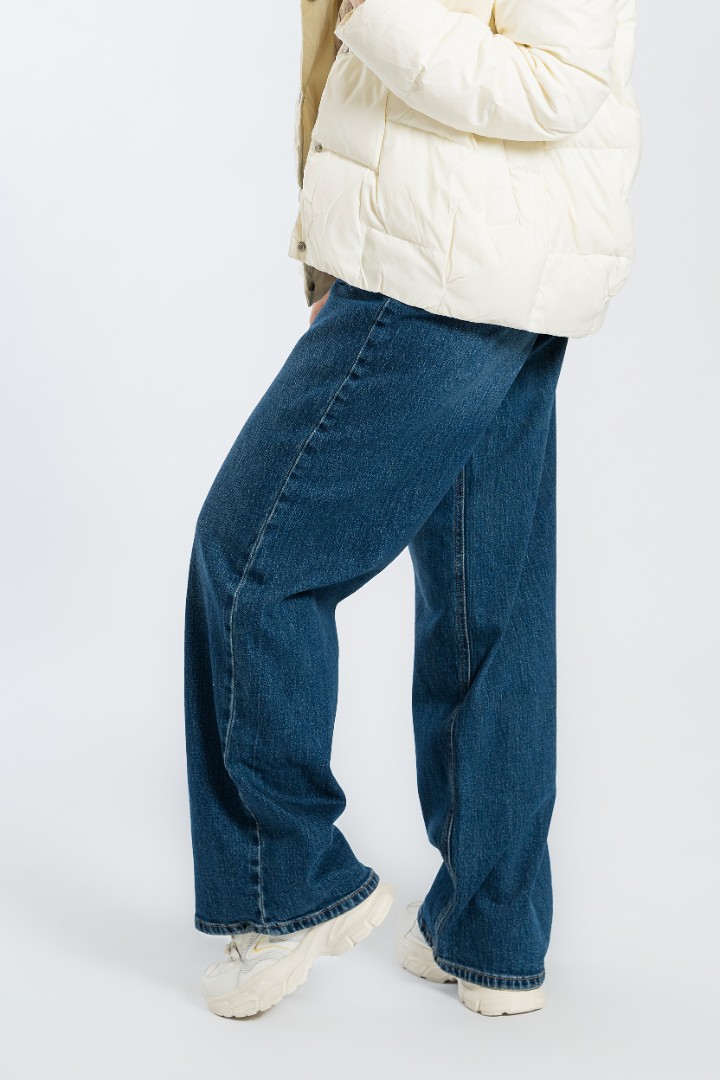 Pantaloni Baggy din denim. Croiala largă a picioarelor asigură confortul la purtare și nu restricționează libertatea mișcărilor. Datorită taliei neprecizate, se adaptează la diferite tipuri de constituție fizică și asigură o potrivire confortabilă.