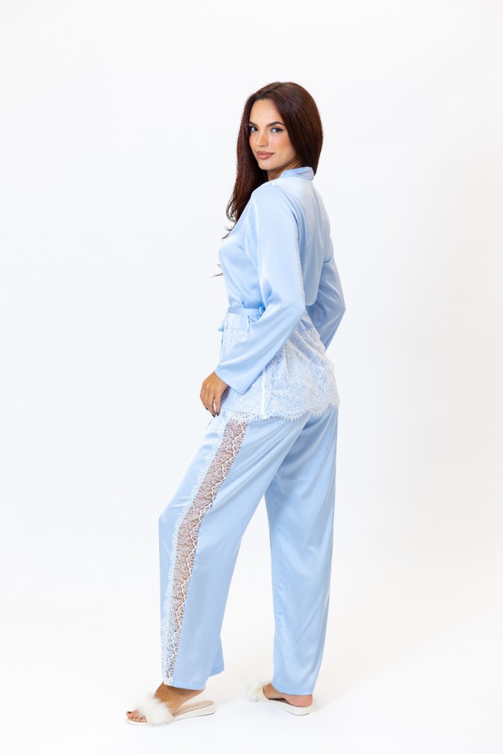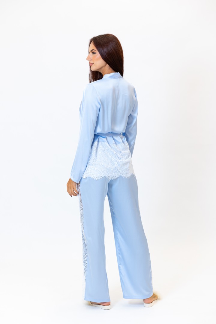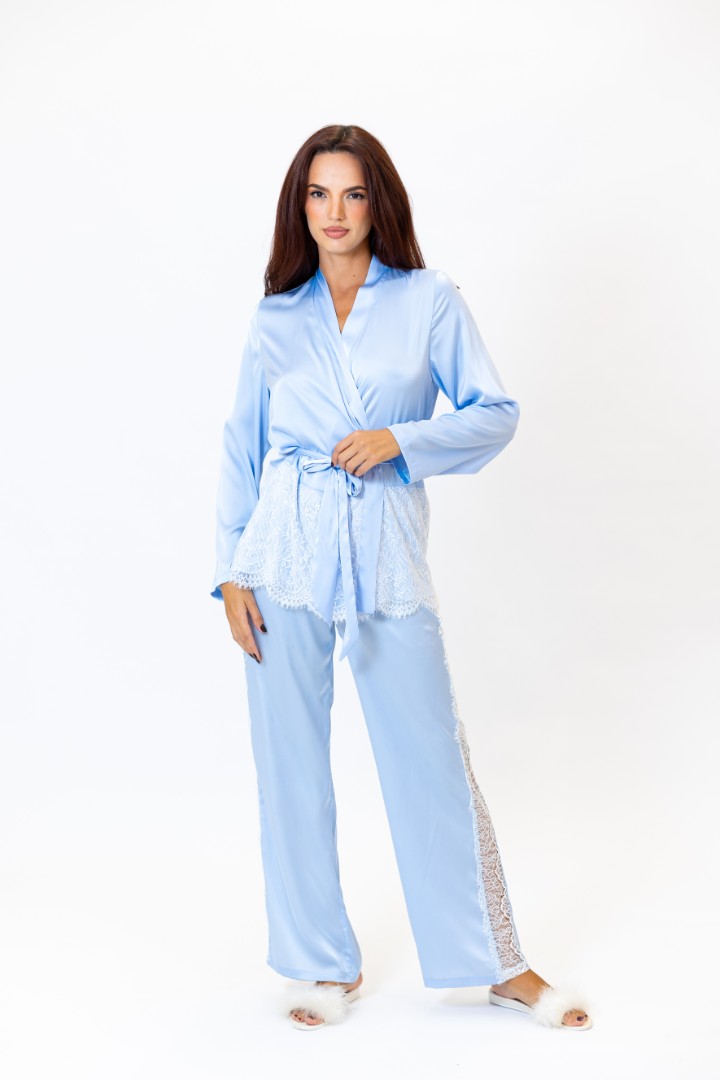 Pijama compusă dintr-un kimono și pantaloni. Kimono cu mâneci lungi, cu curea la talie. Pantaloni cu talie elastică.