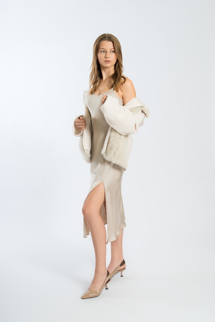 Jacheta pentru femei cu guler din blană de culoare ecru.