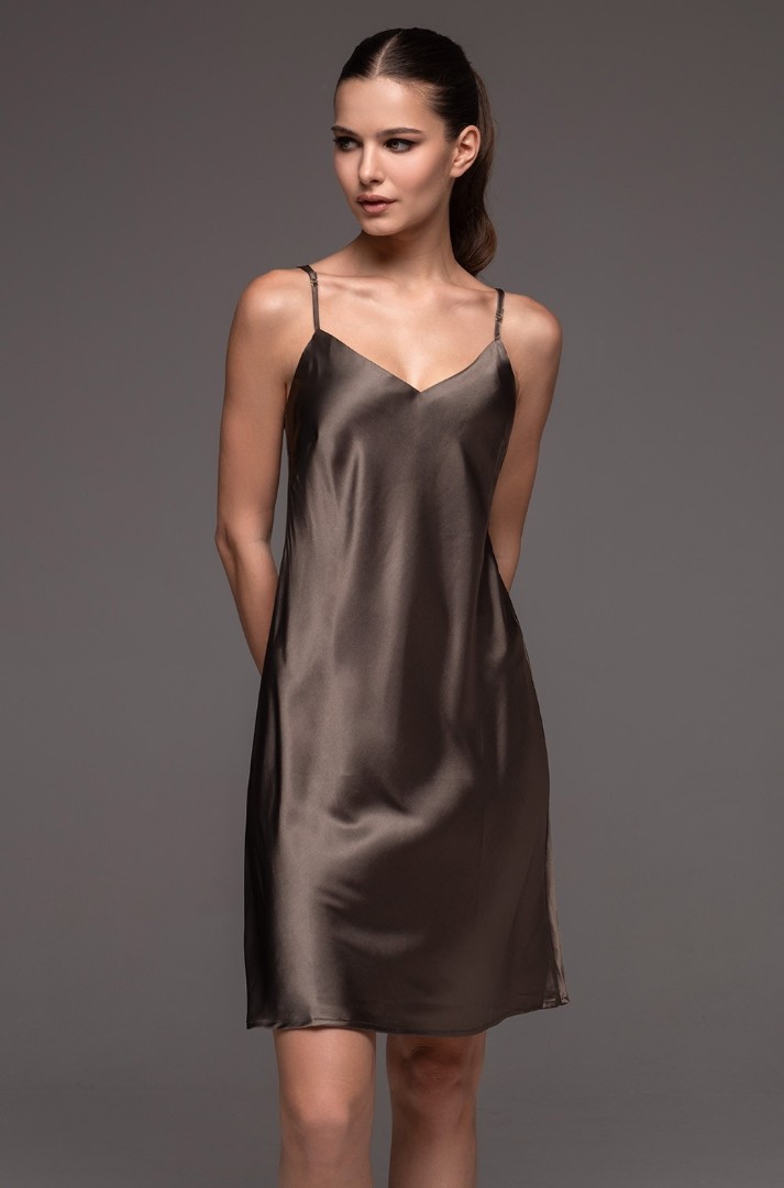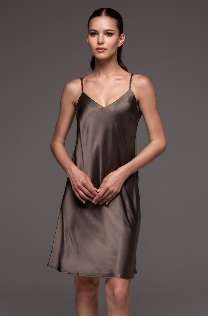 Cămașă de noapte simplă și scurtă, cu bretele subțiri și fără decupaj sub bust. Confecționată dintr-un amestec de mătase uni.