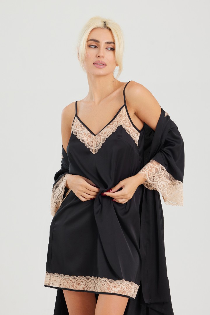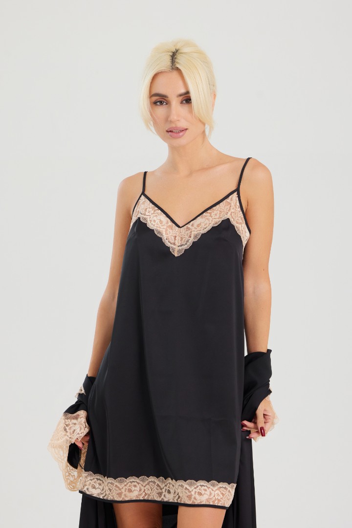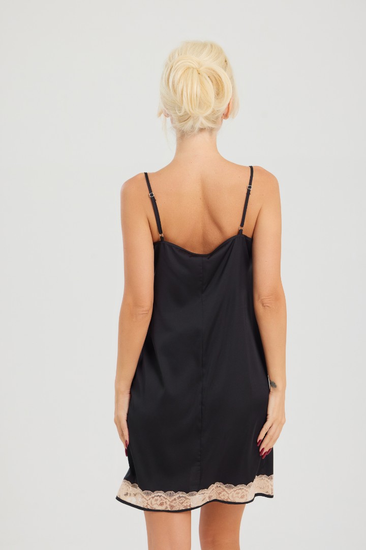 Camasa de noapte din satin cu bretele reglabile, decorata cu dantela.