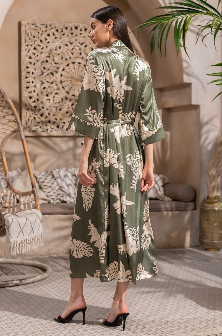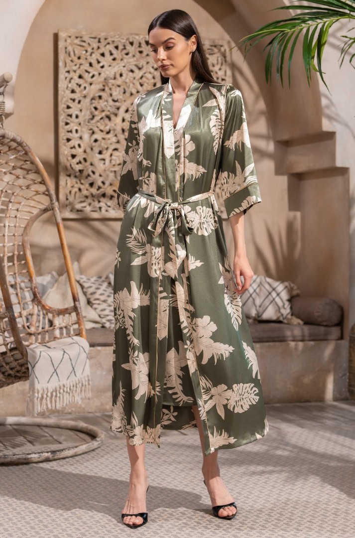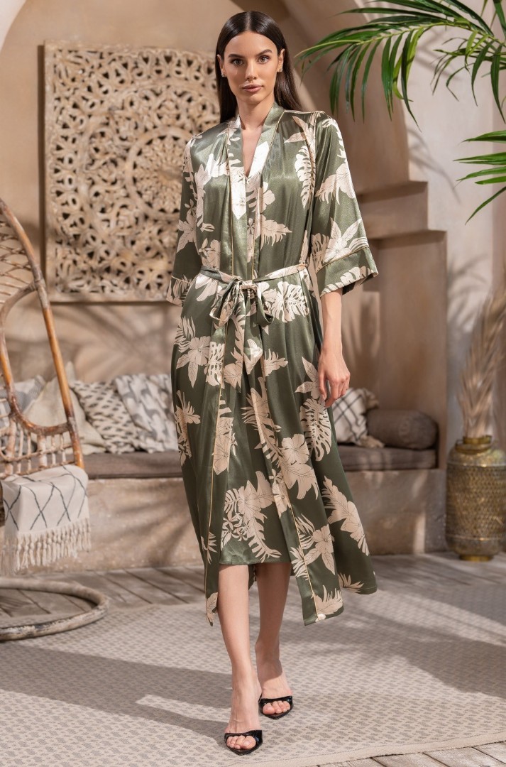 Halatul elegant și lung cu nasturi Mia-Amore este confecționat din țesătură de mătase amestecată cu imprimeu. Marginile halatului și manșetele largi cusute pe mâneci ¾ sunt decorate cu borduri subțiri, în culori uni, asortate cu imprimeul. În cusăturile laterale sunt aplicate buzunare. Setul include o centură.