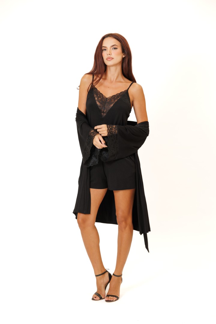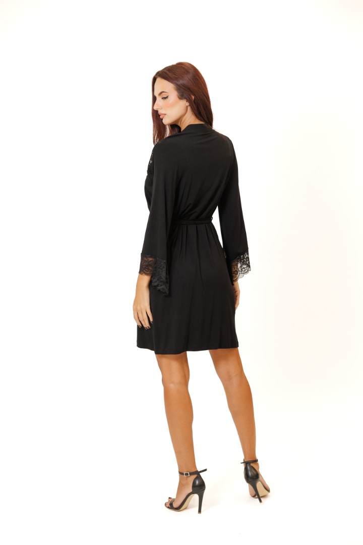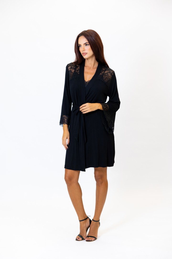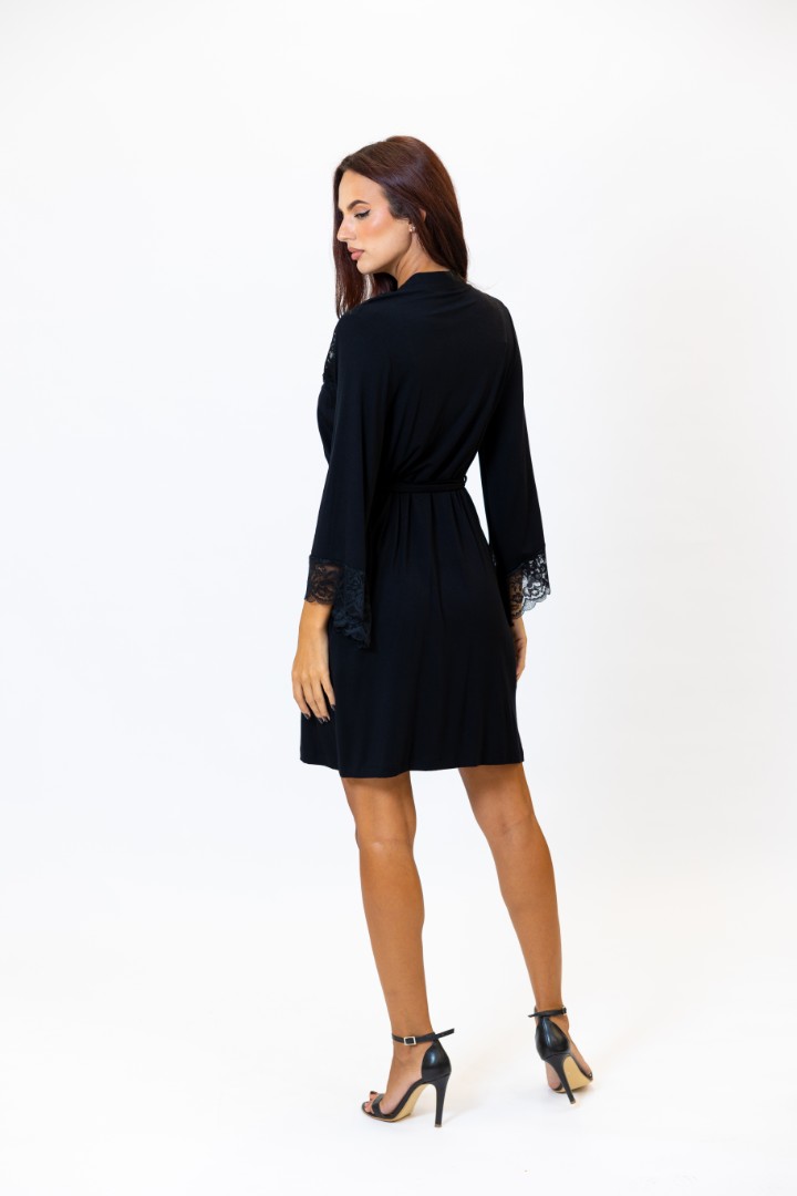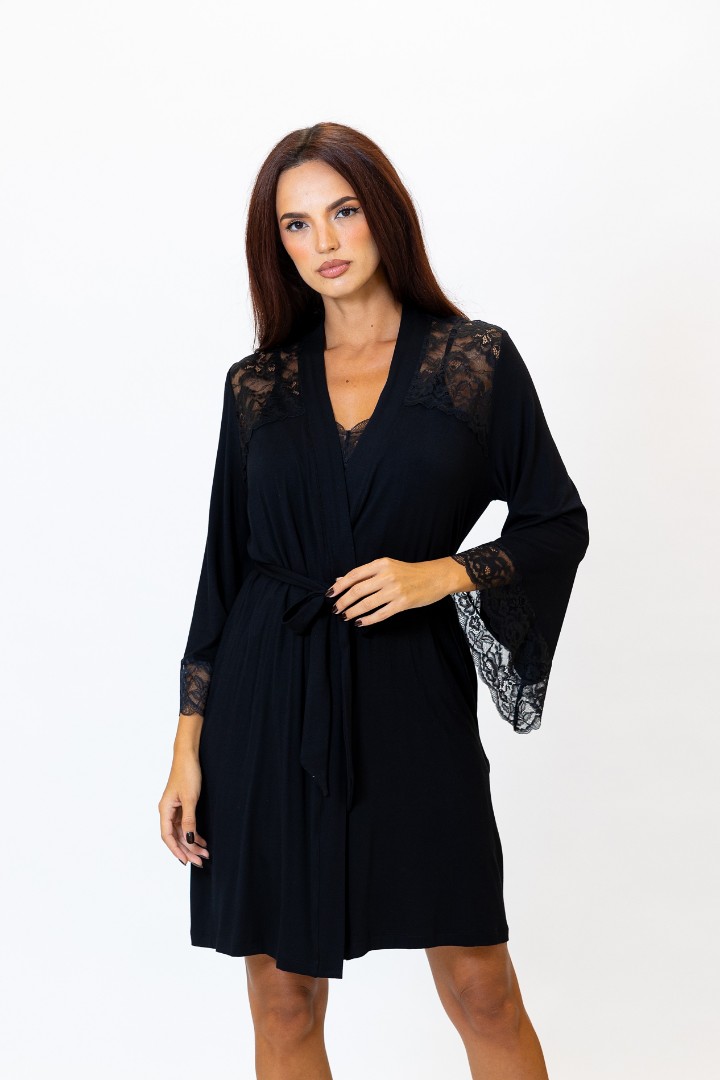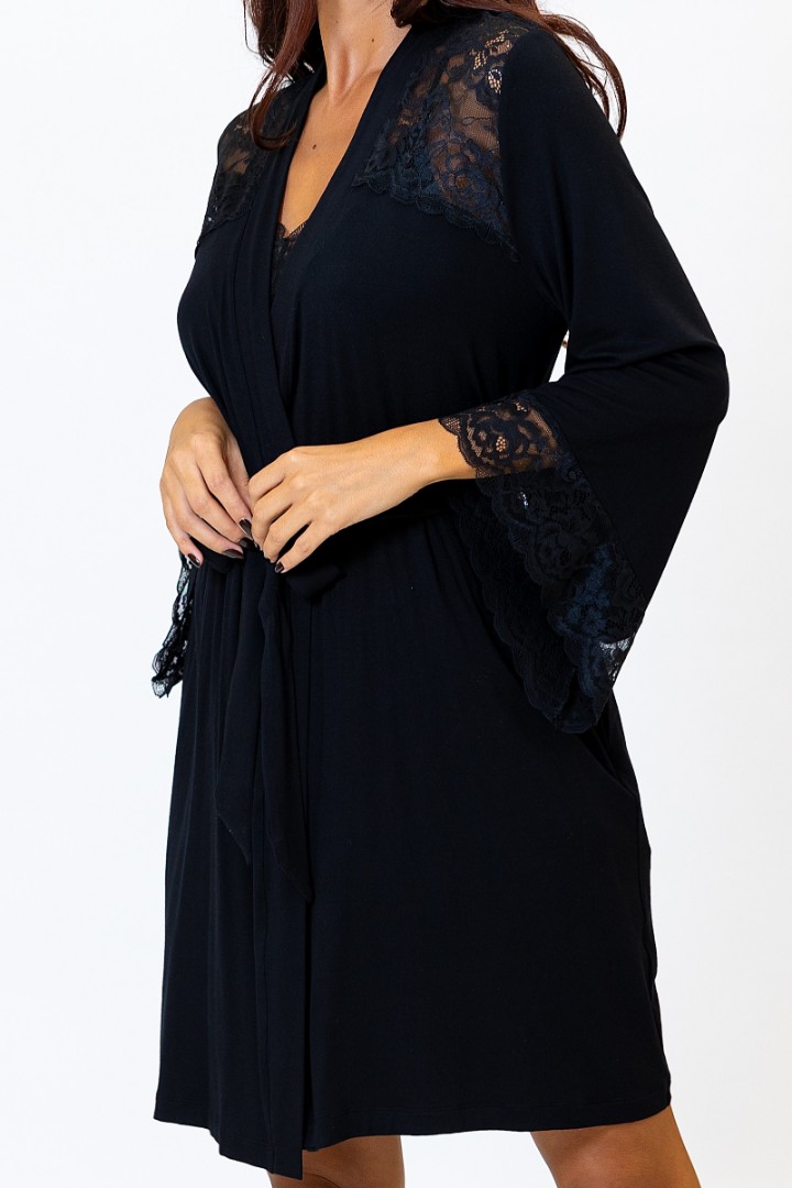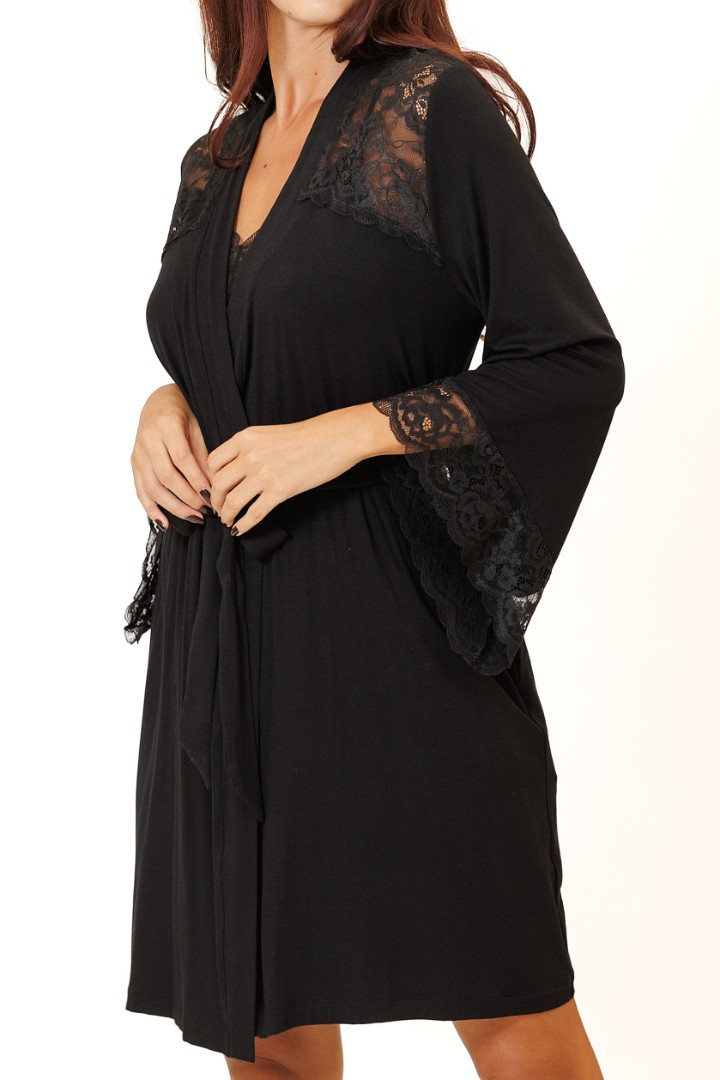 Halat pentru femei cu curea detașabilă. Mânecile sunt decorate cu dantelă.