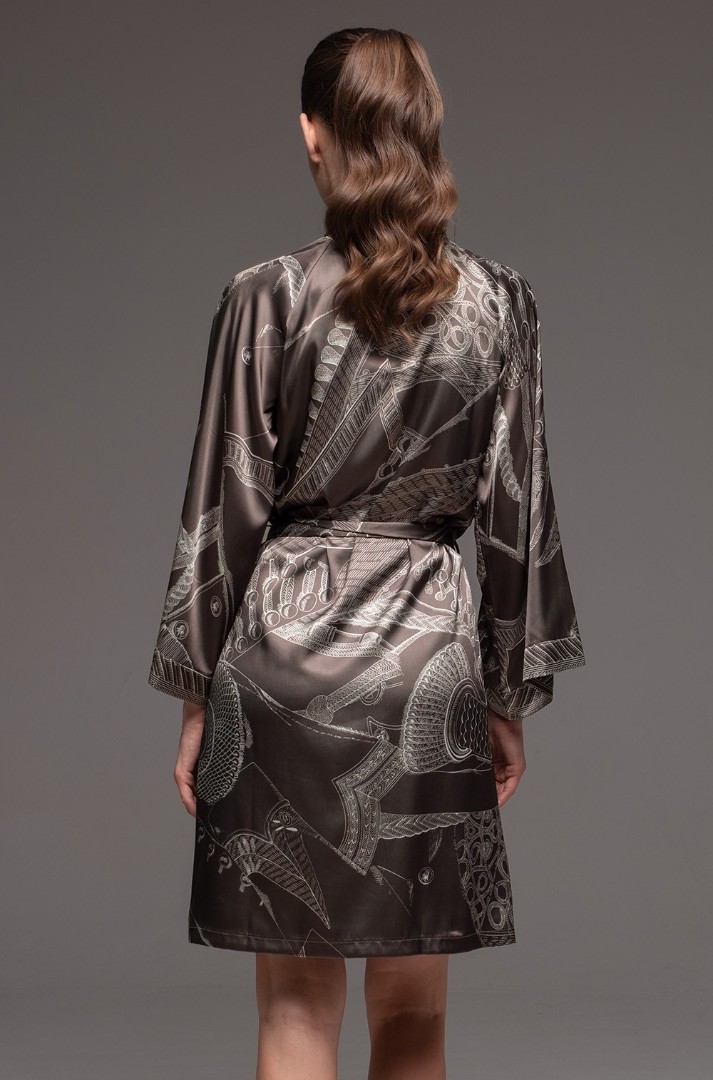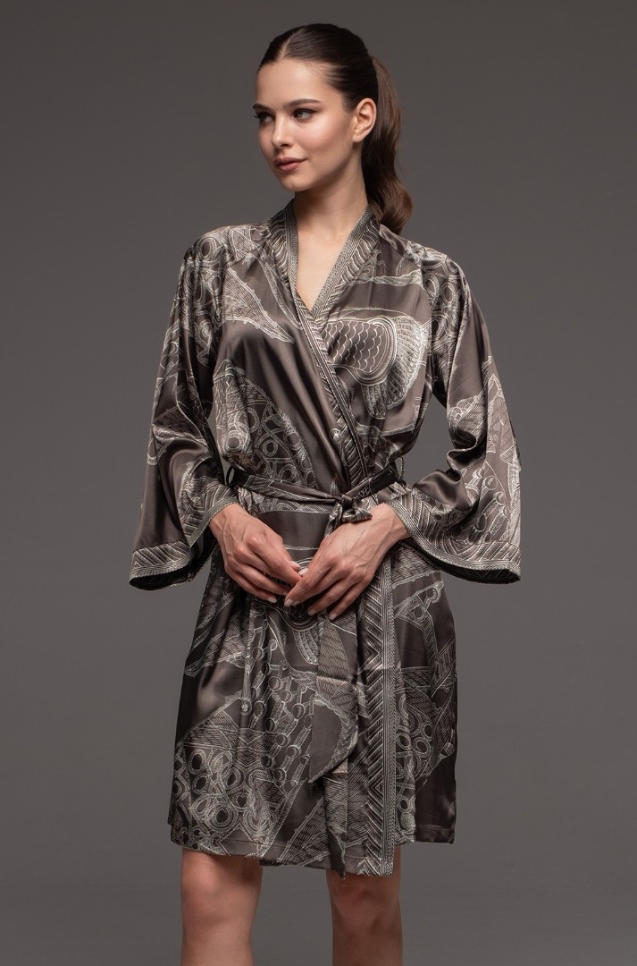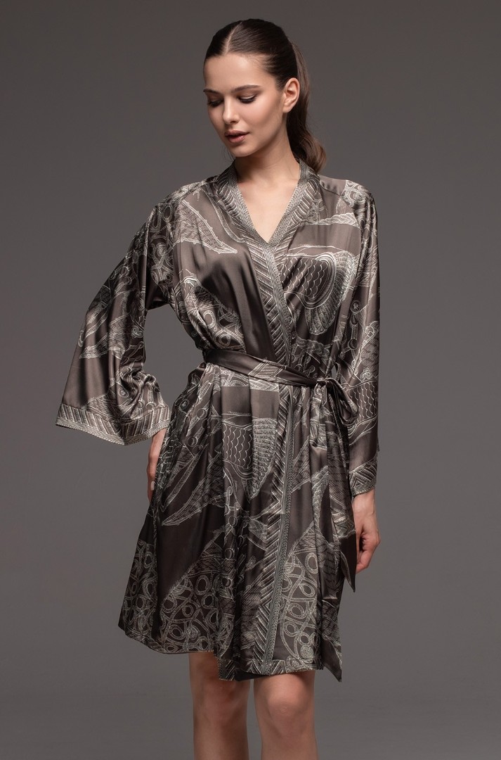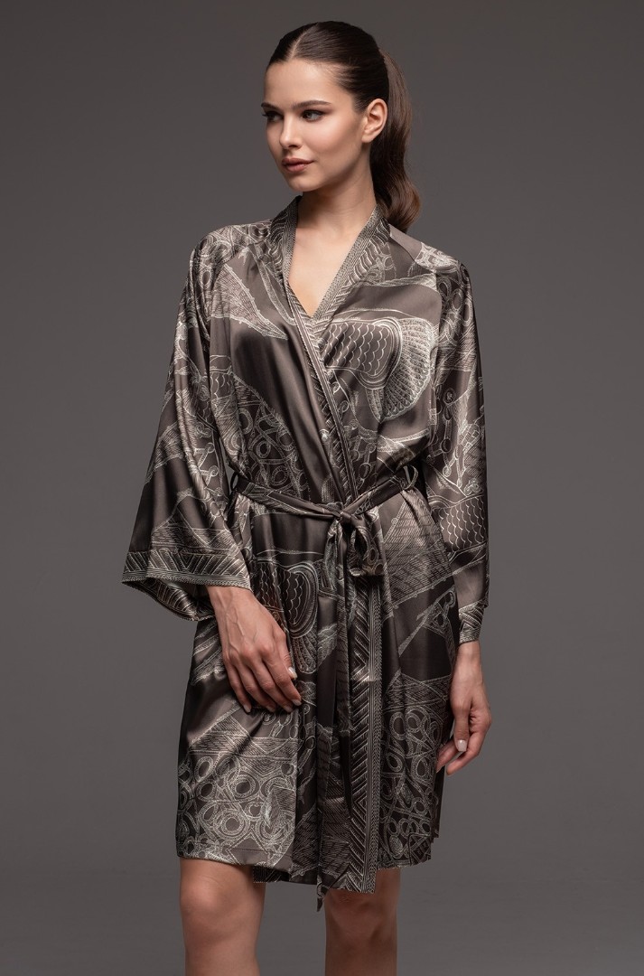 Halat scurt, înfășurat în jurul corpului, de la Mia-Amore, cu mâneci largi și lungi. Este confecționat dintr-un amestec de mătase imprimată și are buzunare laterale.