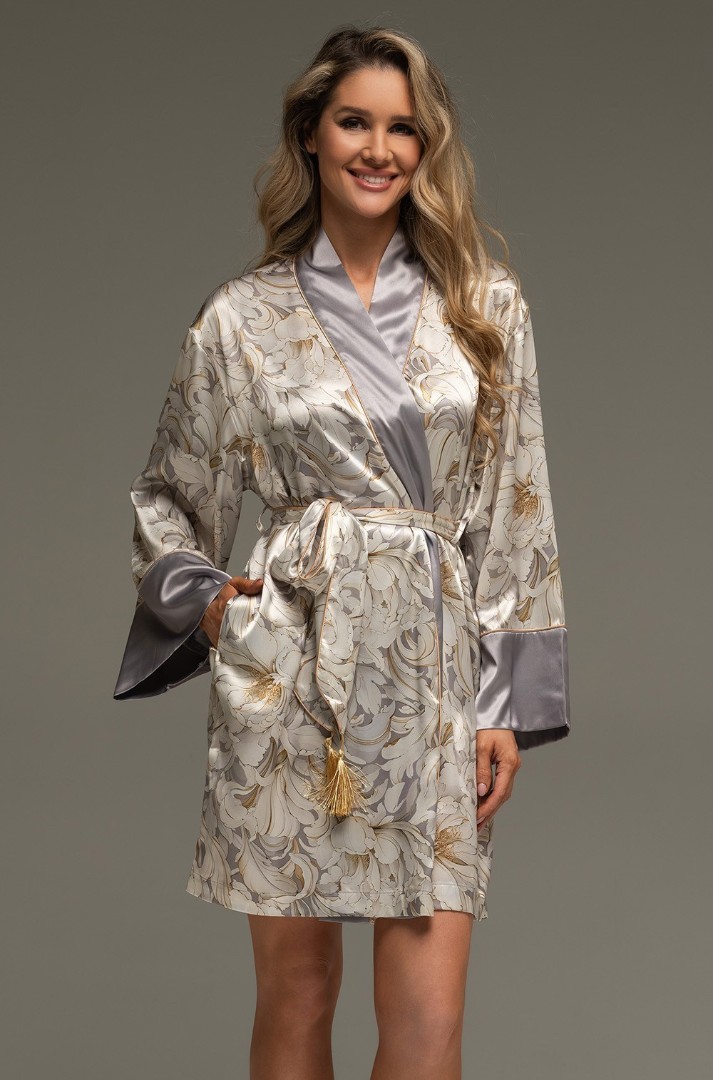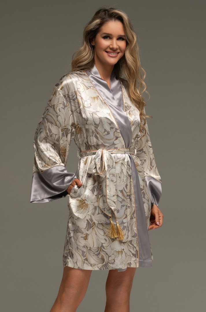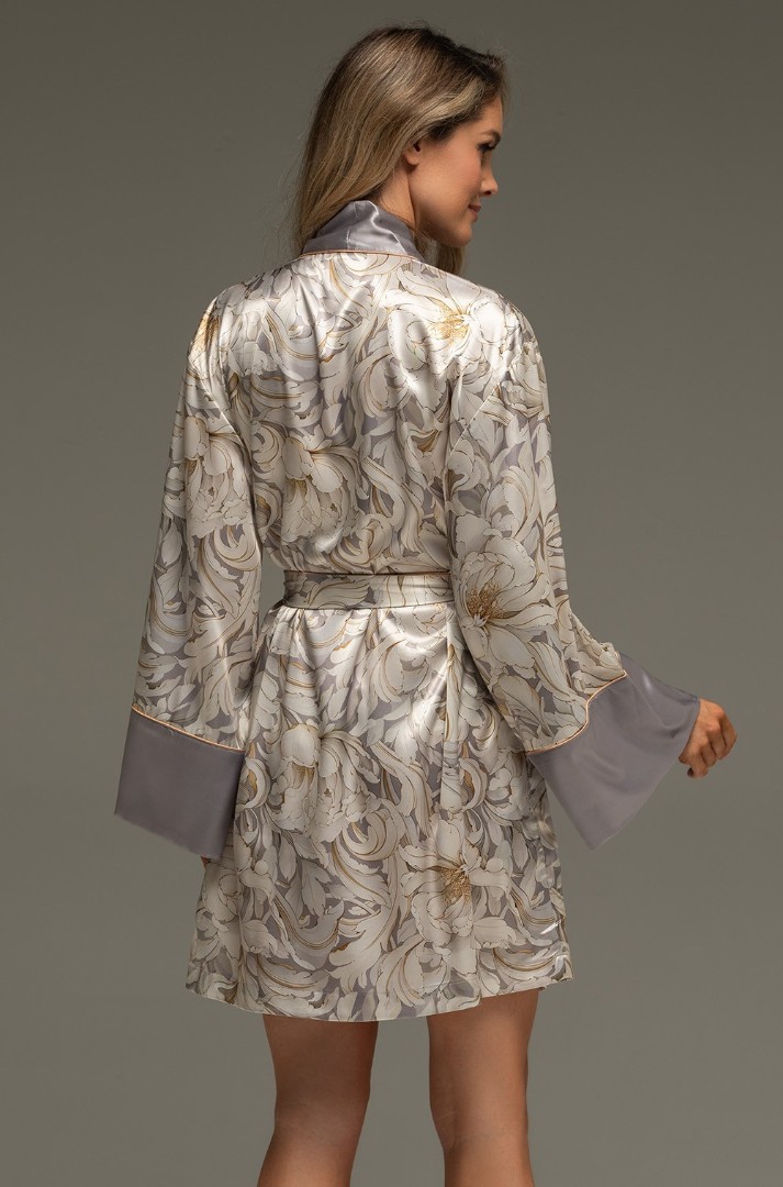 Halatul scurt Mia-Amore este confecționat dintr-un amestec de mătase imprimată. Fesele gri-opal și manșetele late sunt tivite cu paspoal fin auriu. Cureaua lată a halatului este împodobită cu ciucuri aurii. Sunt prezente și buzunare laterale cu cusături.