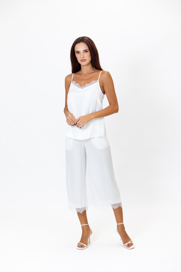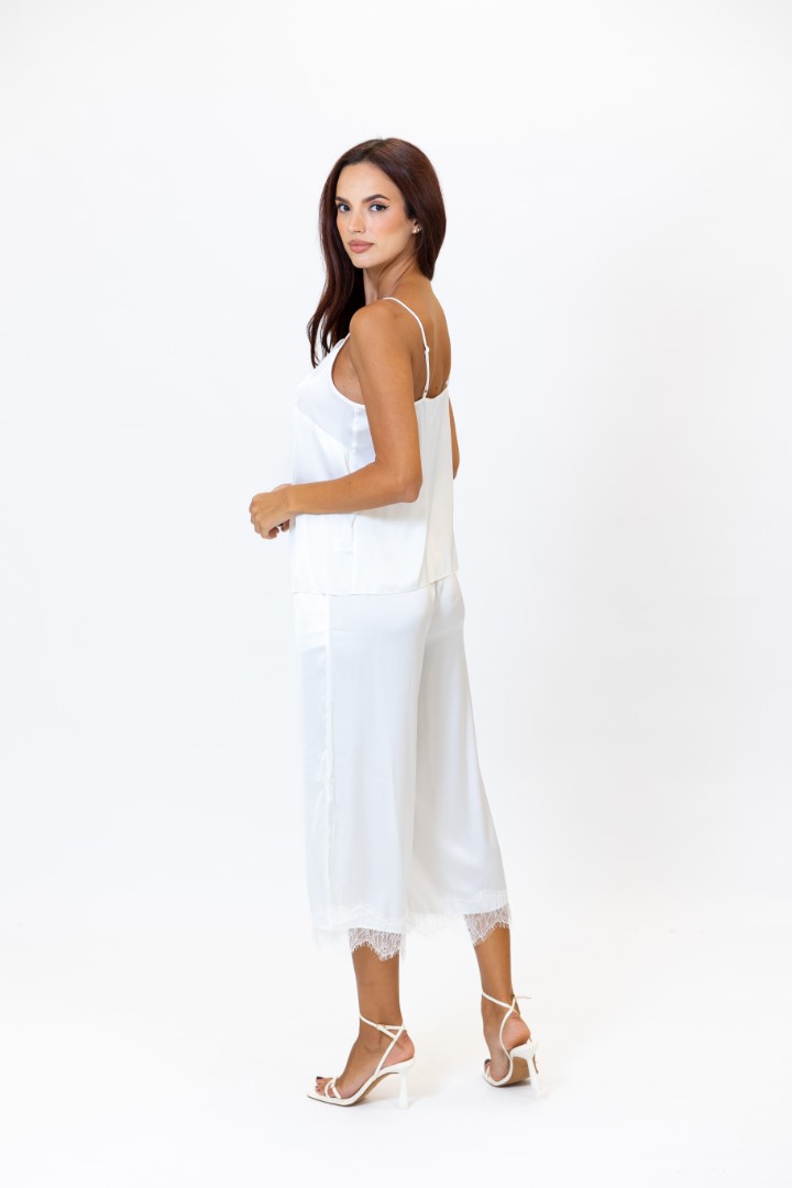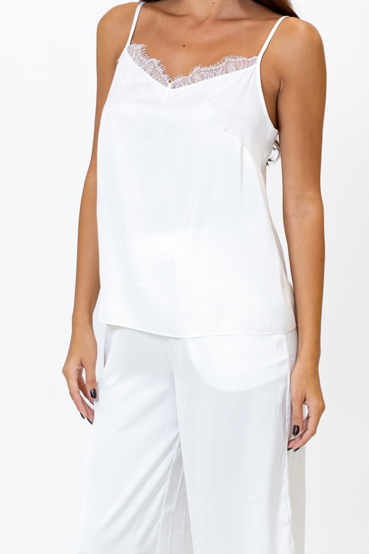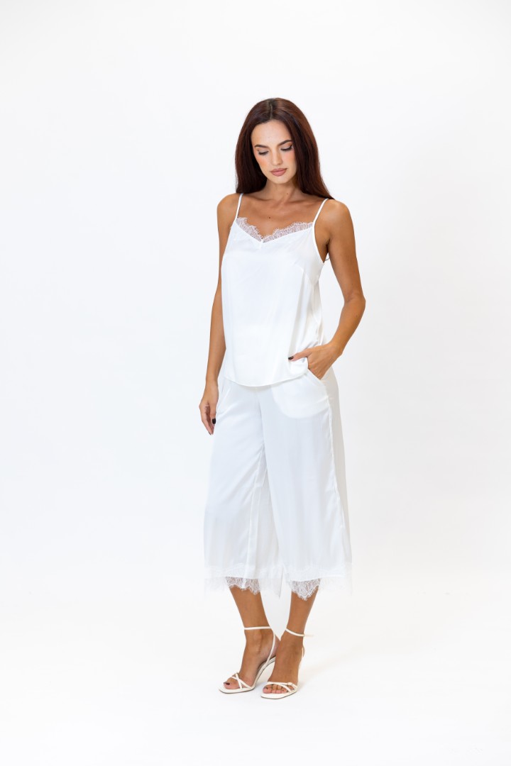 Pijama din satin pentru femei. Se compune dintr-un top și pantaloni. Decorată cu dantelă.