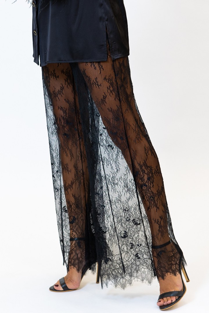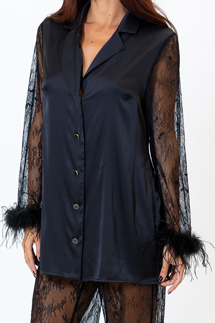 Costum de casă din dantelă cu elemente decorative din pene. Cămașă lungă cu mâneci din dantelă, cu nasturi. Pantaloni lungi și largi din dantelă transparentă.