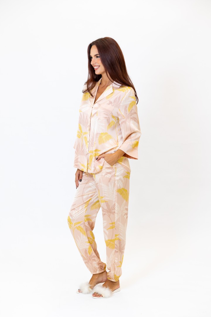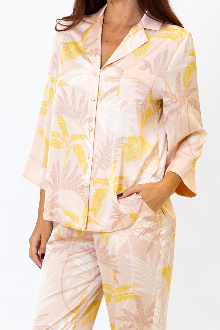 Pijama cu croială dreaptă din matasre cu imprimeu, compusă din cămașă și pantaloni. Cămașă cu mânecă lunga și manșete in contrast. Guler cu rever, închidere frontală cu nasturi pe toată lungimea și buzunar aplicat. Pantaloni cu elastic în talie, buzunare pe laterală și manșete cu elastic la tiv.