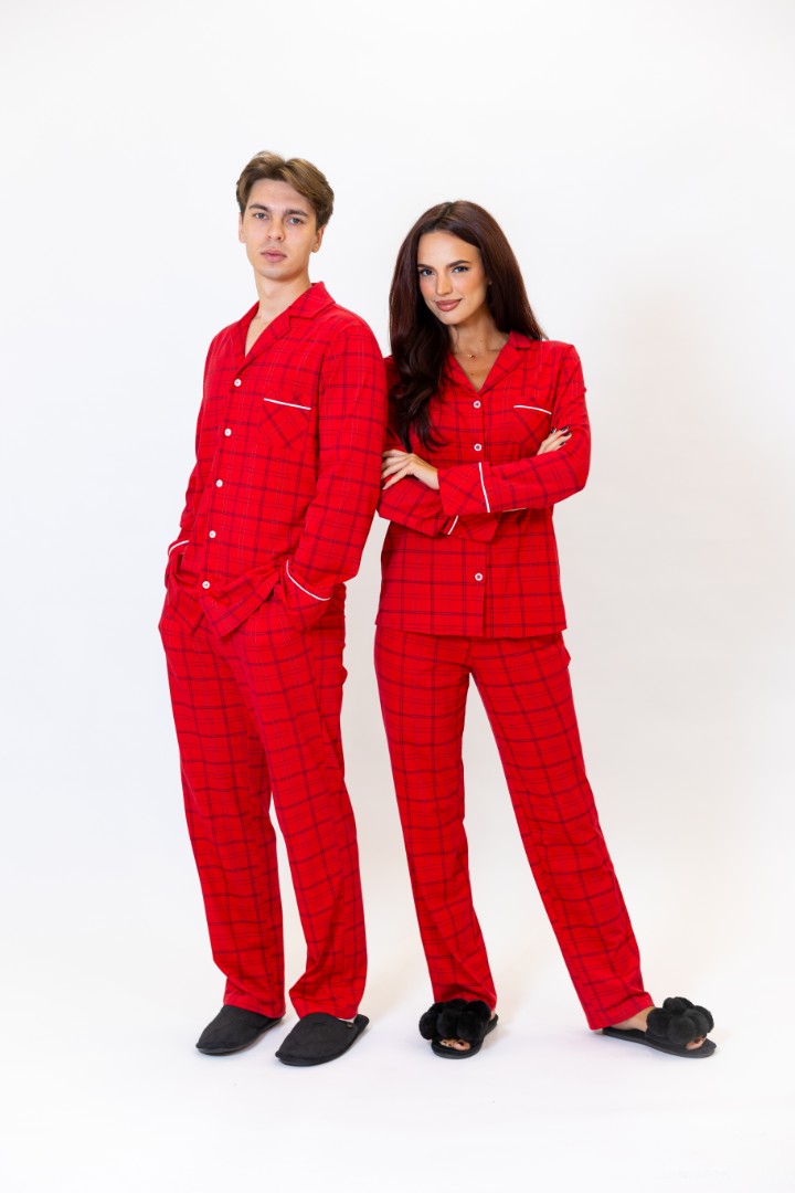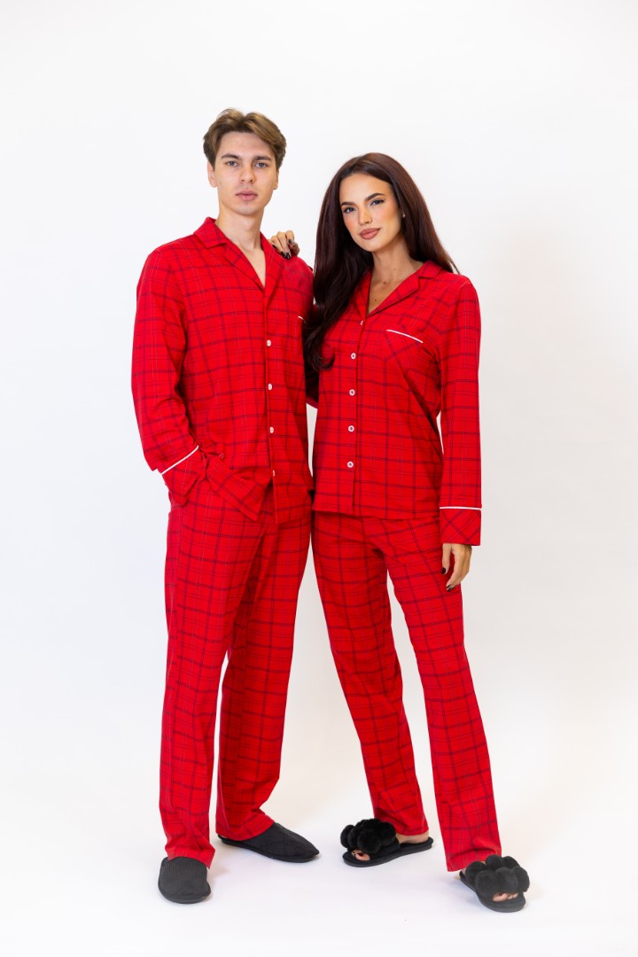 Costum de casă din bumbac. Cămașă cu mâneci lungi și nasturi. Pantaloni drepți cu buzunare laterale.