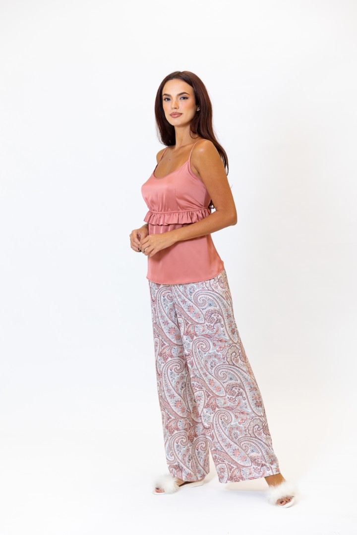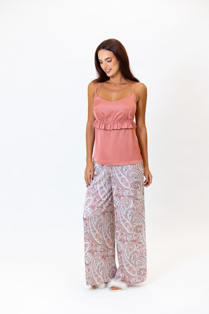 Pijama cu pantaloni largi. Top cu bretele reglabile. O bandă elastică și volane sub bust fac piesa mai jucăușă și mai sexy.