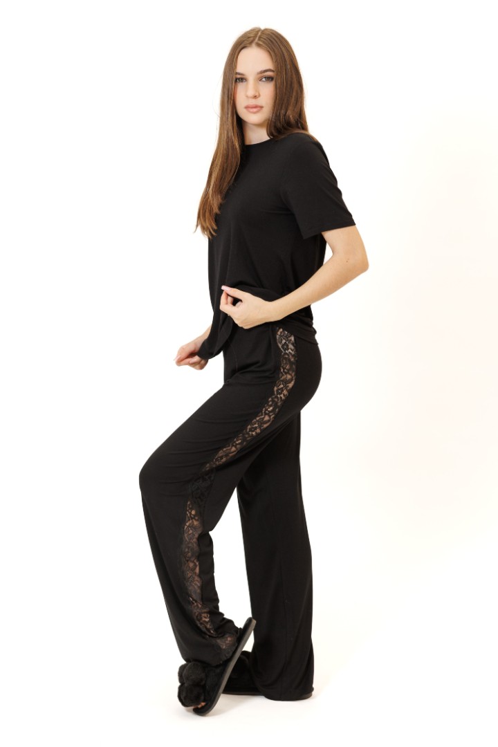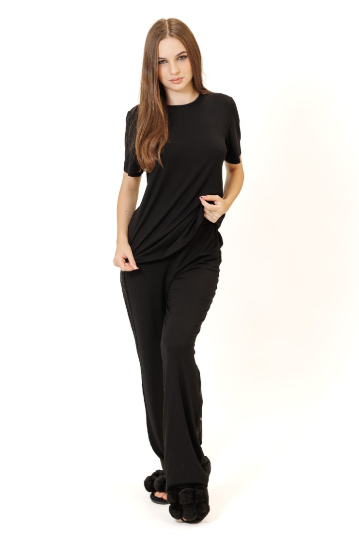 Pijama din viscoza moale. Tricou cu decolteu in V din dantela pe spate. Pantalonii lungi sunt decorati cu dantela pe partile laterale.