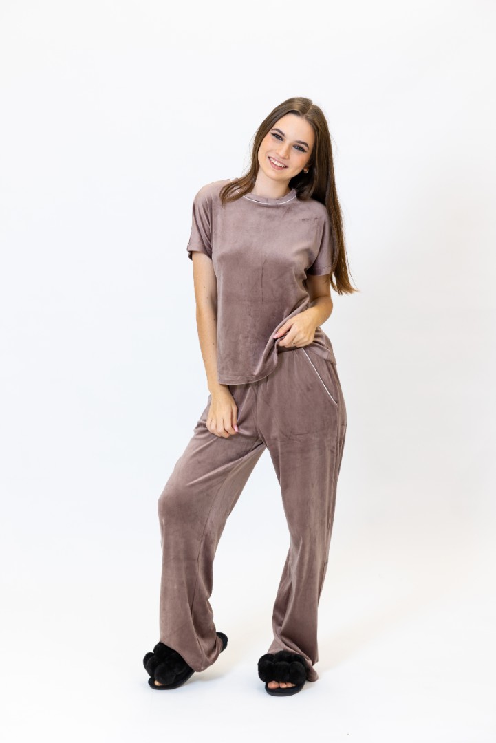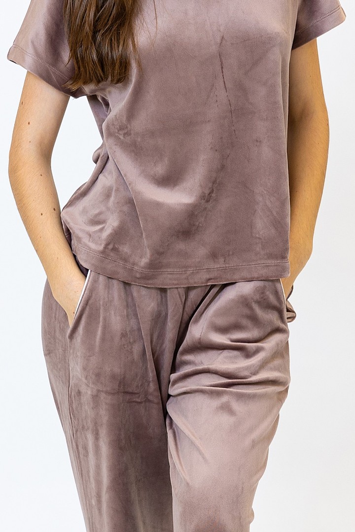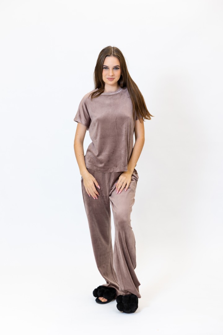 Pijamaua pentru femei din catifea moale, consta dintr-un tricou si pantaloni.