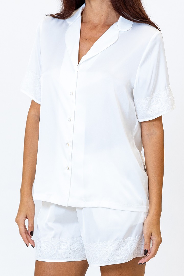 Pijama cu croială dreaptă, compusă din sacou și pantaloni scurți. Pantaloni scurți silueta evazata cu elastic în talie.