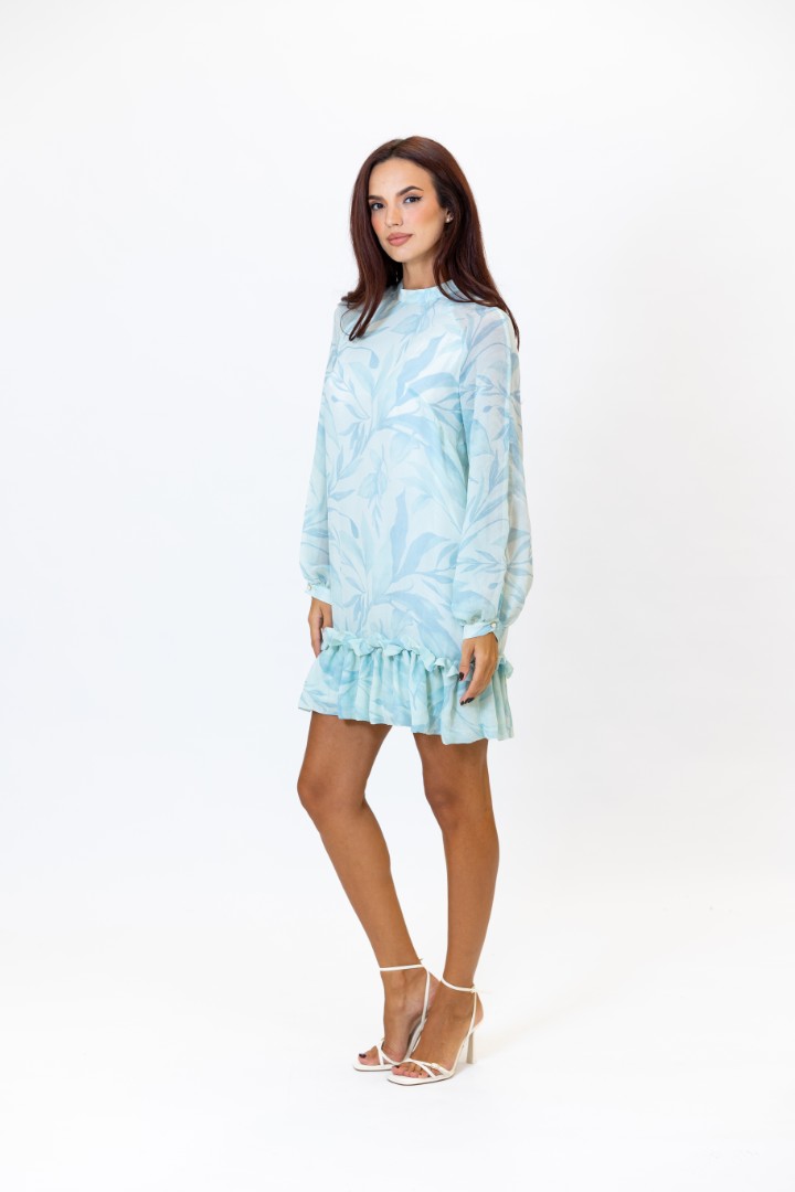 Rochie scurta din sifon cu maneci lungi. Volane de pe marginea rochiei și mânecilor dau produsului sensibilitate și ușurință.