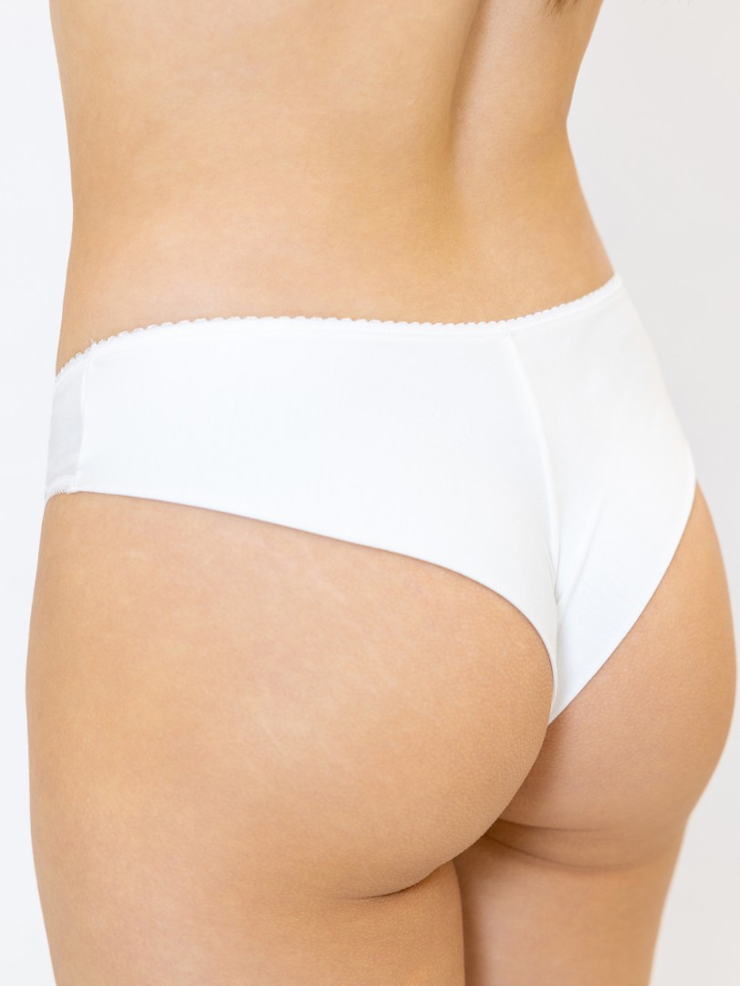 Chiloți braziliana pentru femei cu talie medie. Confecționați din țesătură elastică, decorați cu inserții de dantelă elastică.