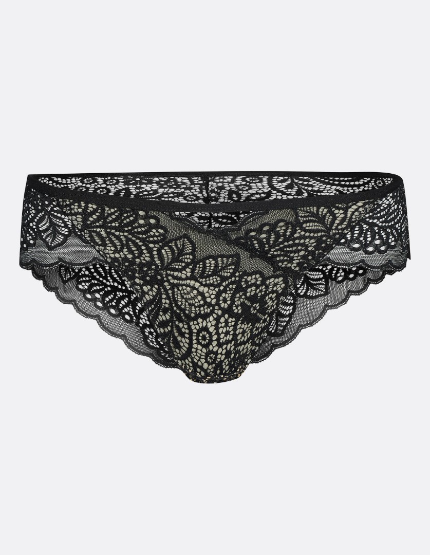 Chiloți din dantelă. Confecționați din dantelă delicată, ajurată. Bandă elastică subțire și plată. Partea din față este finisată cu un material opac de culoare contrastantă, iar cea din spate – cu dantelă semitransparentă.