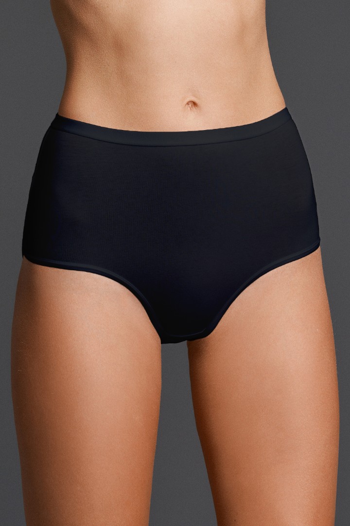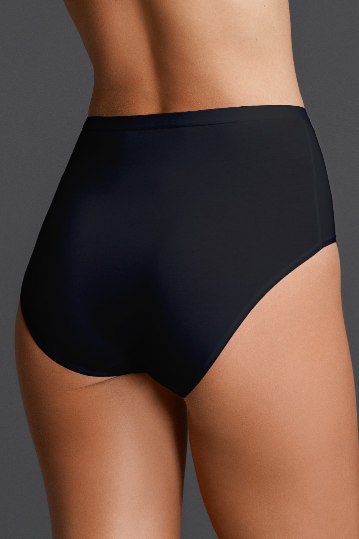 Slipuri cu talie înaltă. Partea din spate acoperă complet fesele. Cureaua lată până la mijlocul taliei creează un efect ușor de corectare și subțiază vizual silueta.