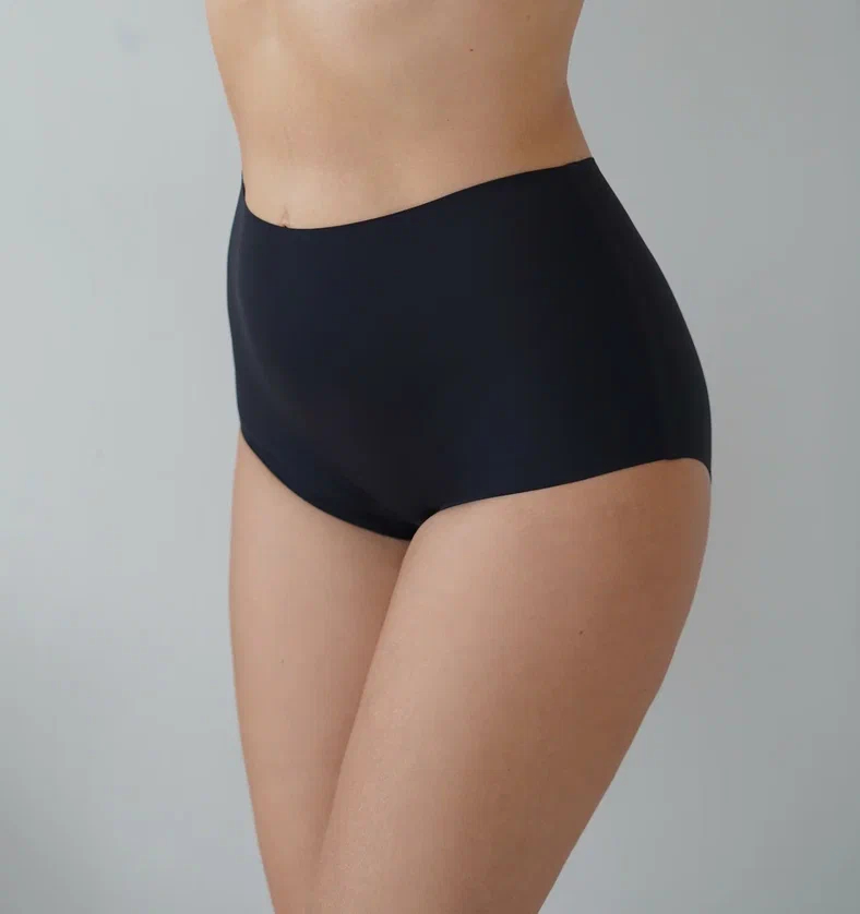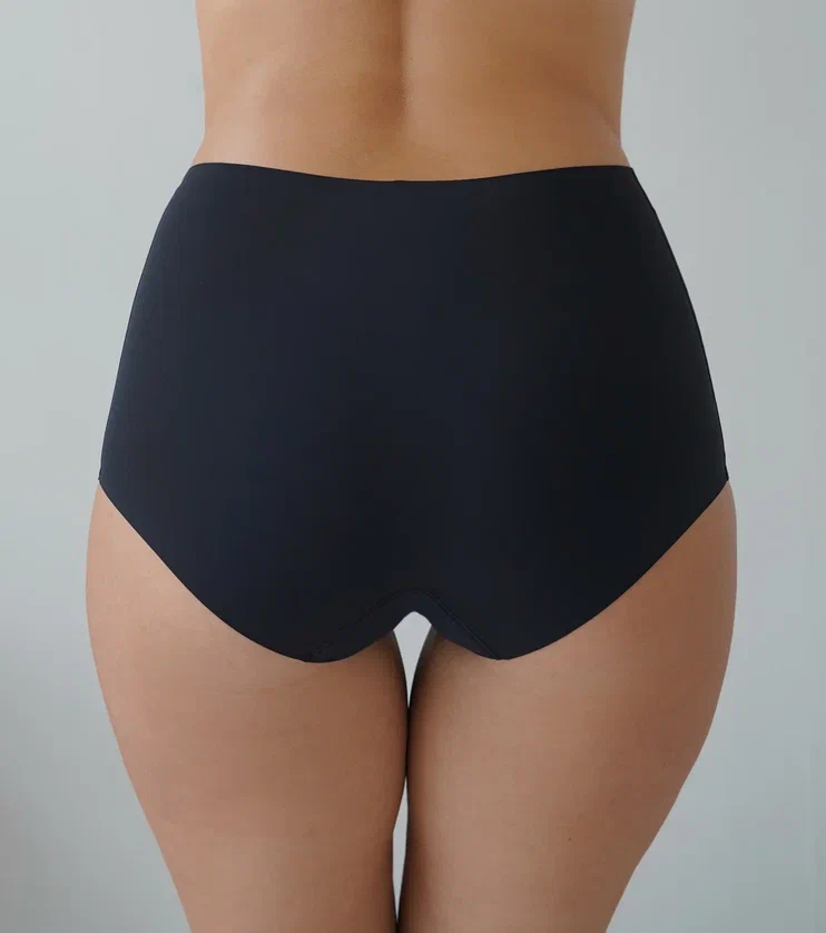 Chiloți cu talie înaltă. Partea din spate acoperă complet fesele. Toate marginile sunt finisate cu bandă adezivă.