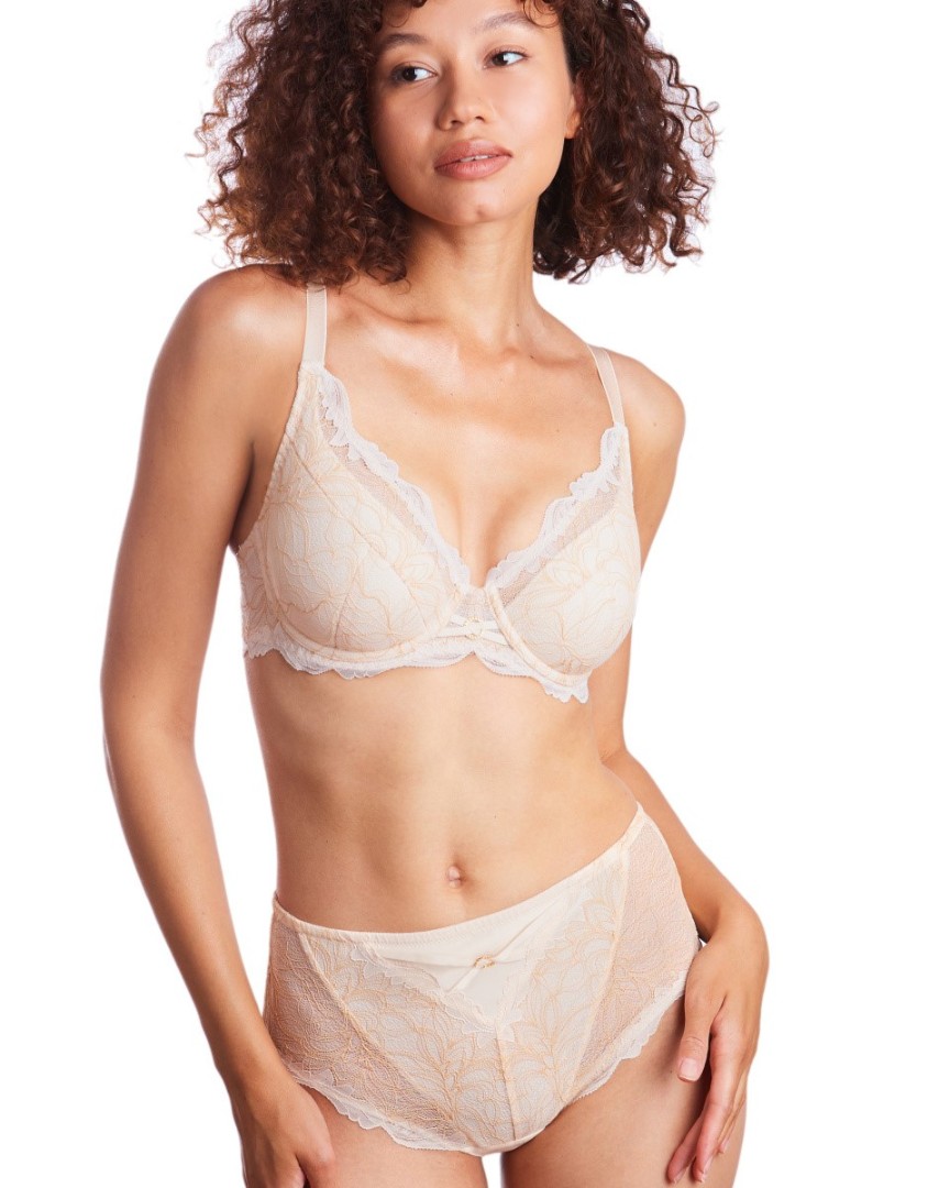 Chiloți slip cu talie înaltă. Dantela delicată decorează frumos coapsele.