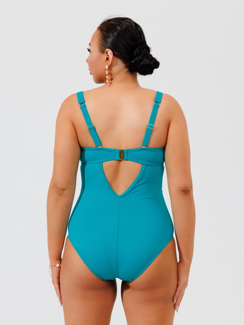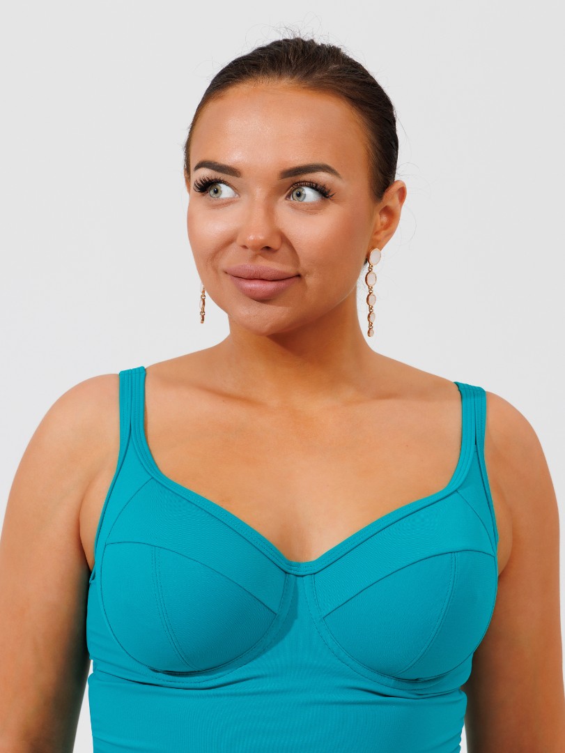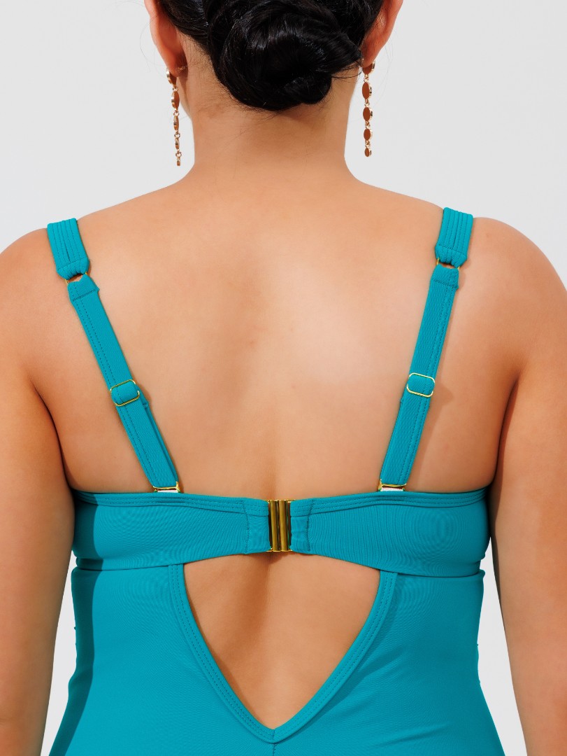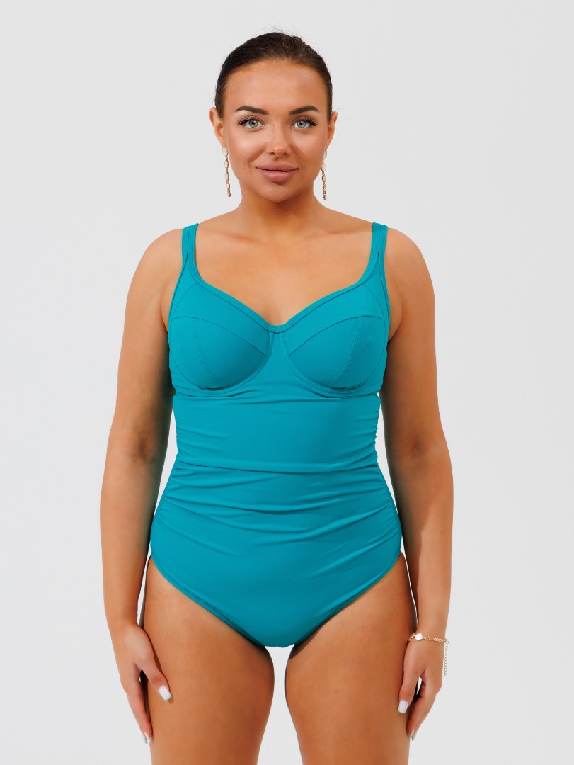 Costum de baie dintr-o singură piesă. Cupe moi pe carcas. Bretelele sunt reglabile pe lungime și se detașează în spate.