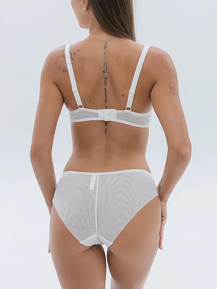 Set de lenjerie intimă. Sutien – cupe modelate pe carcas, cu efect push-up discret. Cupele sunt confecționate din material tip plasă cu dantelă. Chiloți – slip. Confecționați integral din material elastic și neted. Marginea din spate a chiloților este fără cusături.