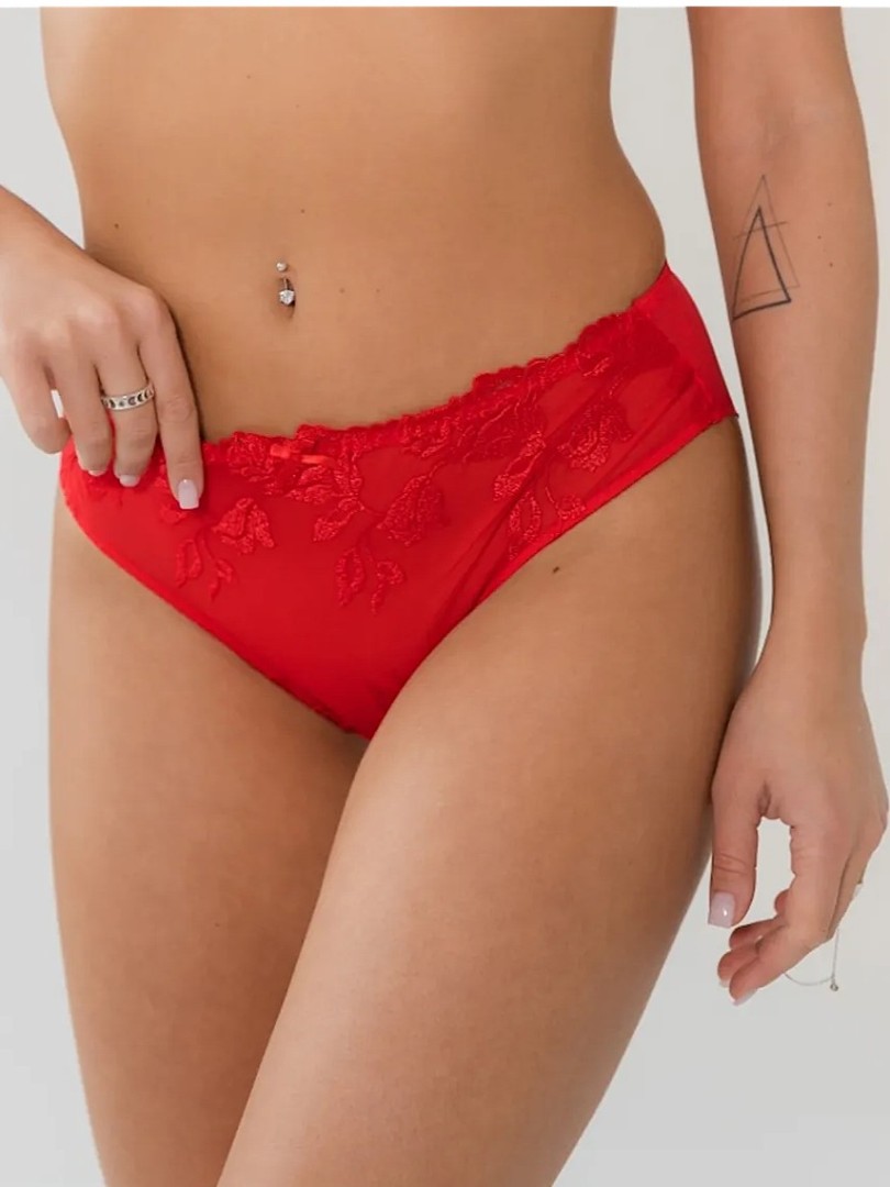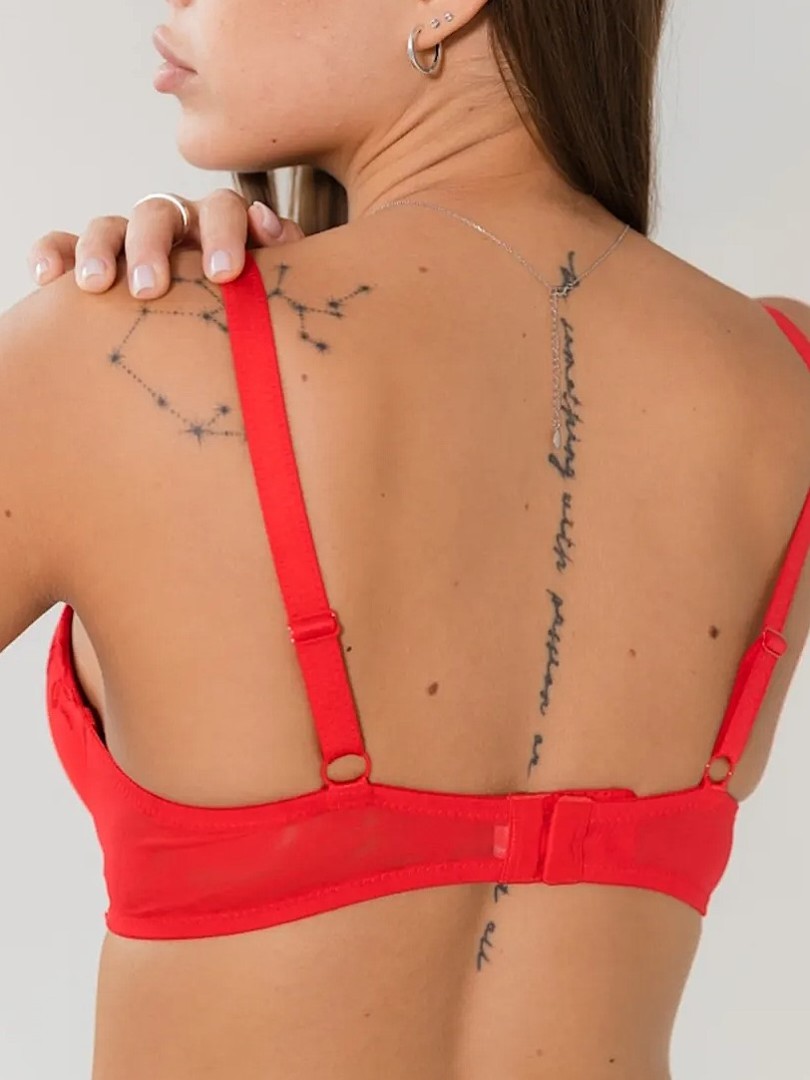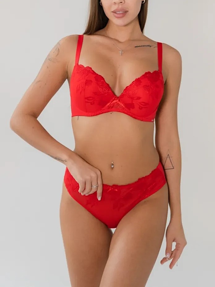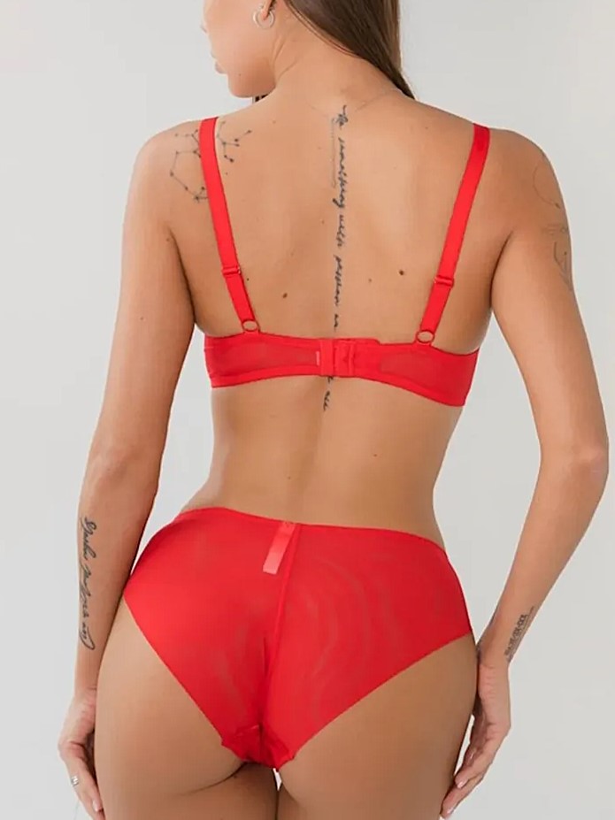 Set de lenjerie intimă. Sutien – cupe modelate pe carcas, cu efect push-up discret. Cupele sunt confecționate din material tip plasă cu dantelă. Chiloți – slip. Confecționați integral din material elastic și neted. Marginea din spate a chiloților este fără cusături.