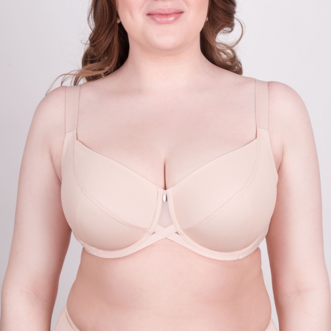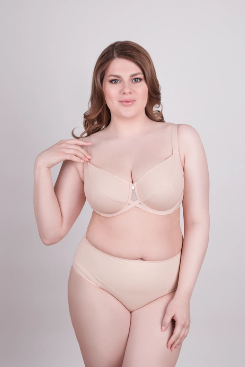 Sutien din tricotaj neelastic si tesatura elastica. Suport din metal. Cupe moi cu trei straturi. Bretele fixate. Sistem de inchidere cu patru linii de reglare.