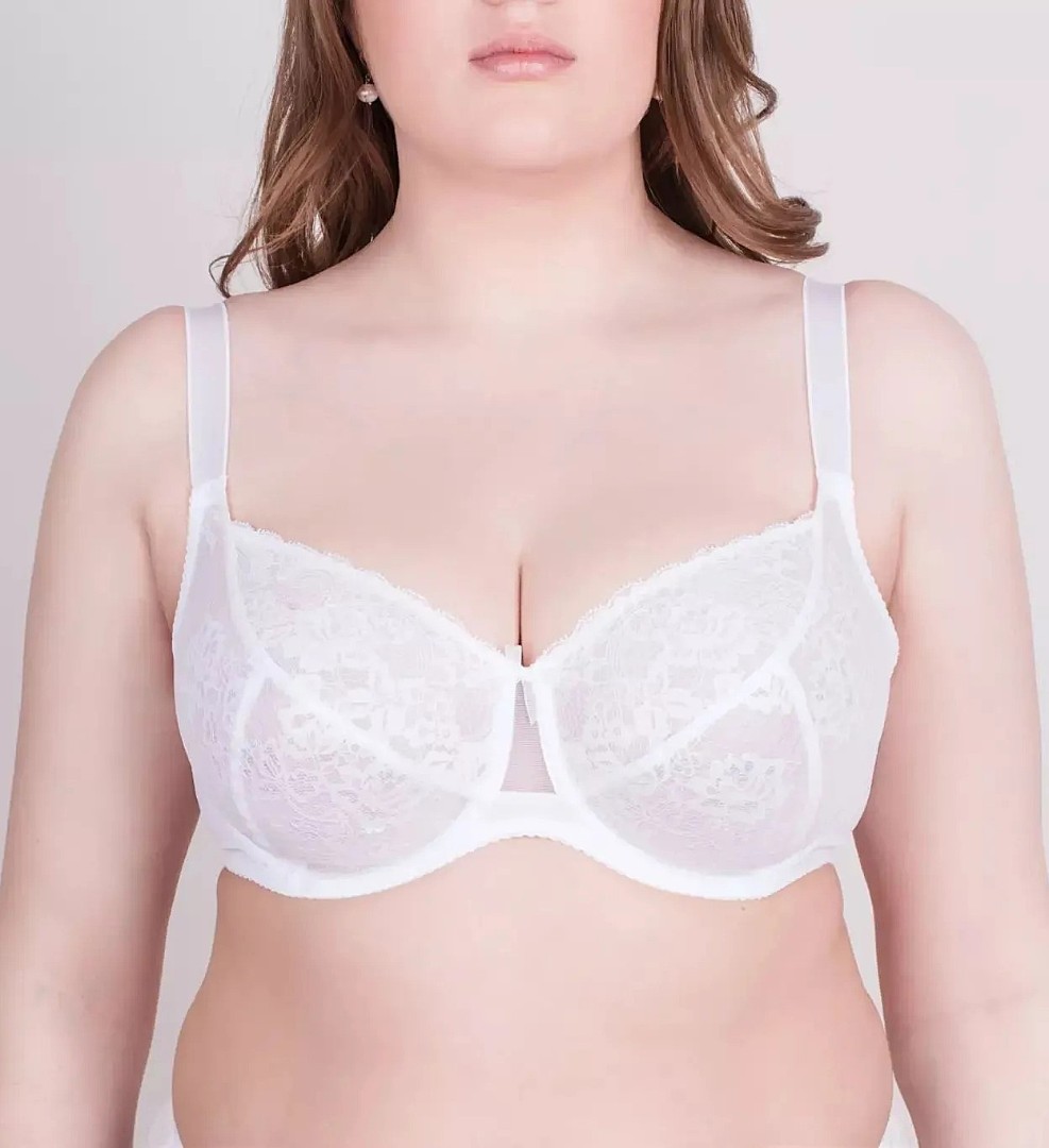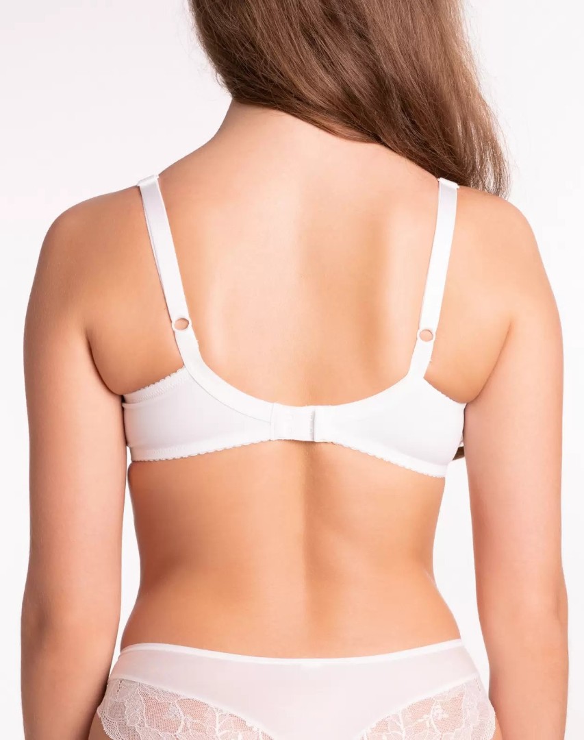 Sutien cu suport din metal. Cupe moi cu trei straturi, captusite cu tesatura din tricotaj neelastic. Detaliu decorativ transparent pe partea centrala a sutienului. Fundita decorativa pe mijloc. Sistem de inchidere format din doua carlige cu patru linii de reglare.